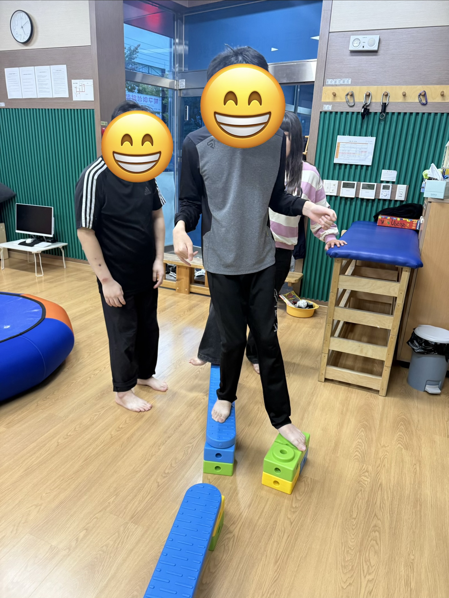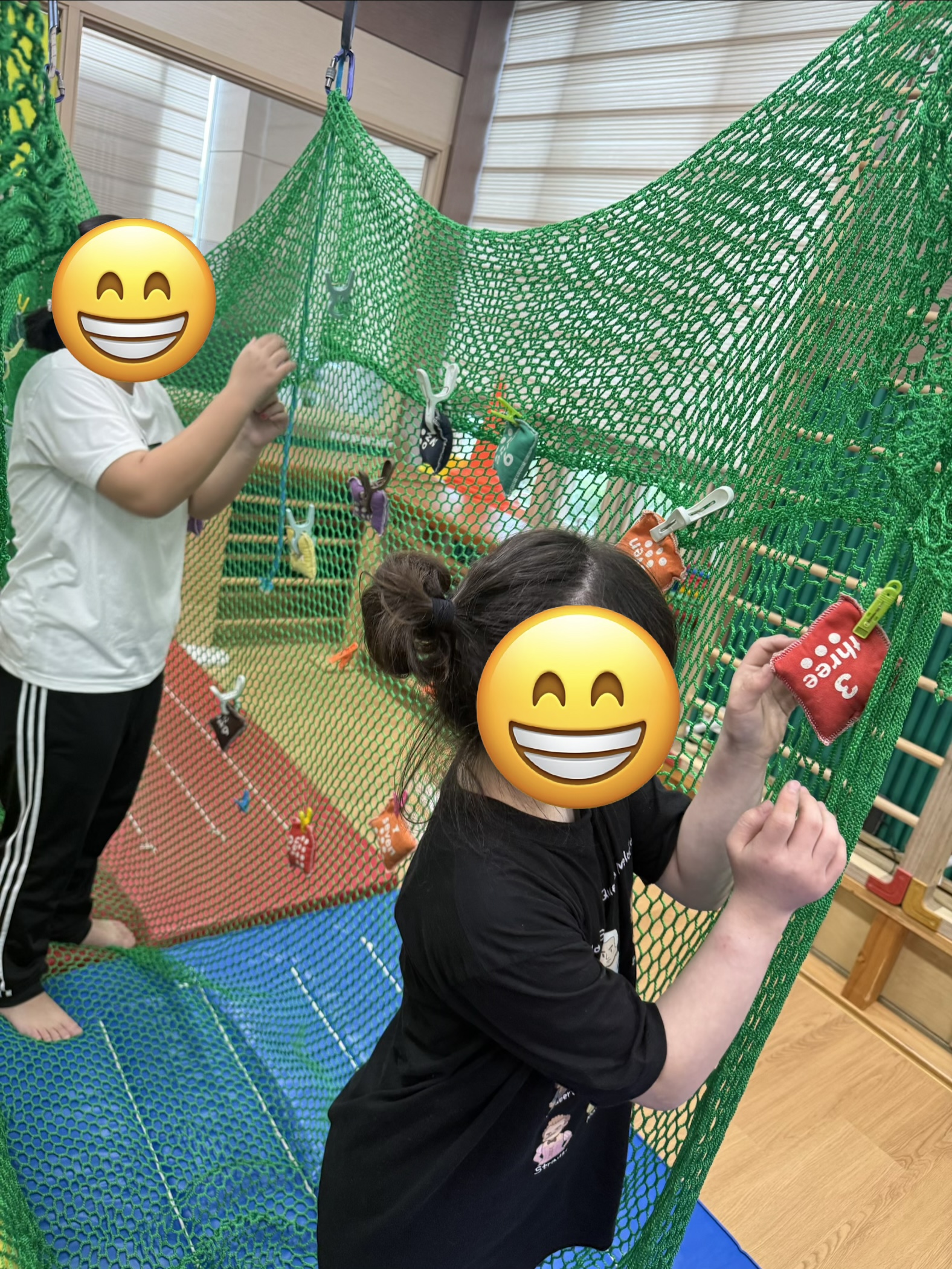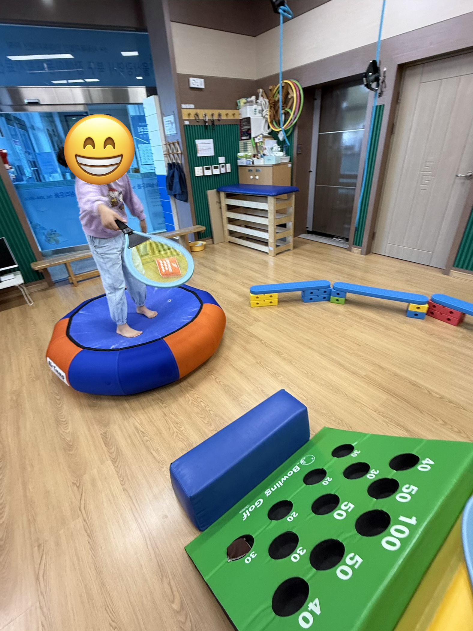 하체의 힘과 왼발-오른발의 협응을 통해 징검다리를 건너며 블럭을 이동시키고, 그물터널을 지나 모래주머니를 획득한 뒤, 배드민턴 라켓을 사용하여 자신의 위치를 인식하고 물체간의 거리조절 통해 점수판에 넣으며 목표물을 주시하는 시각집중력과 손목의 기능적인 움직임을 통한 던지기 기술을 통해 활동을 하였습니다~
