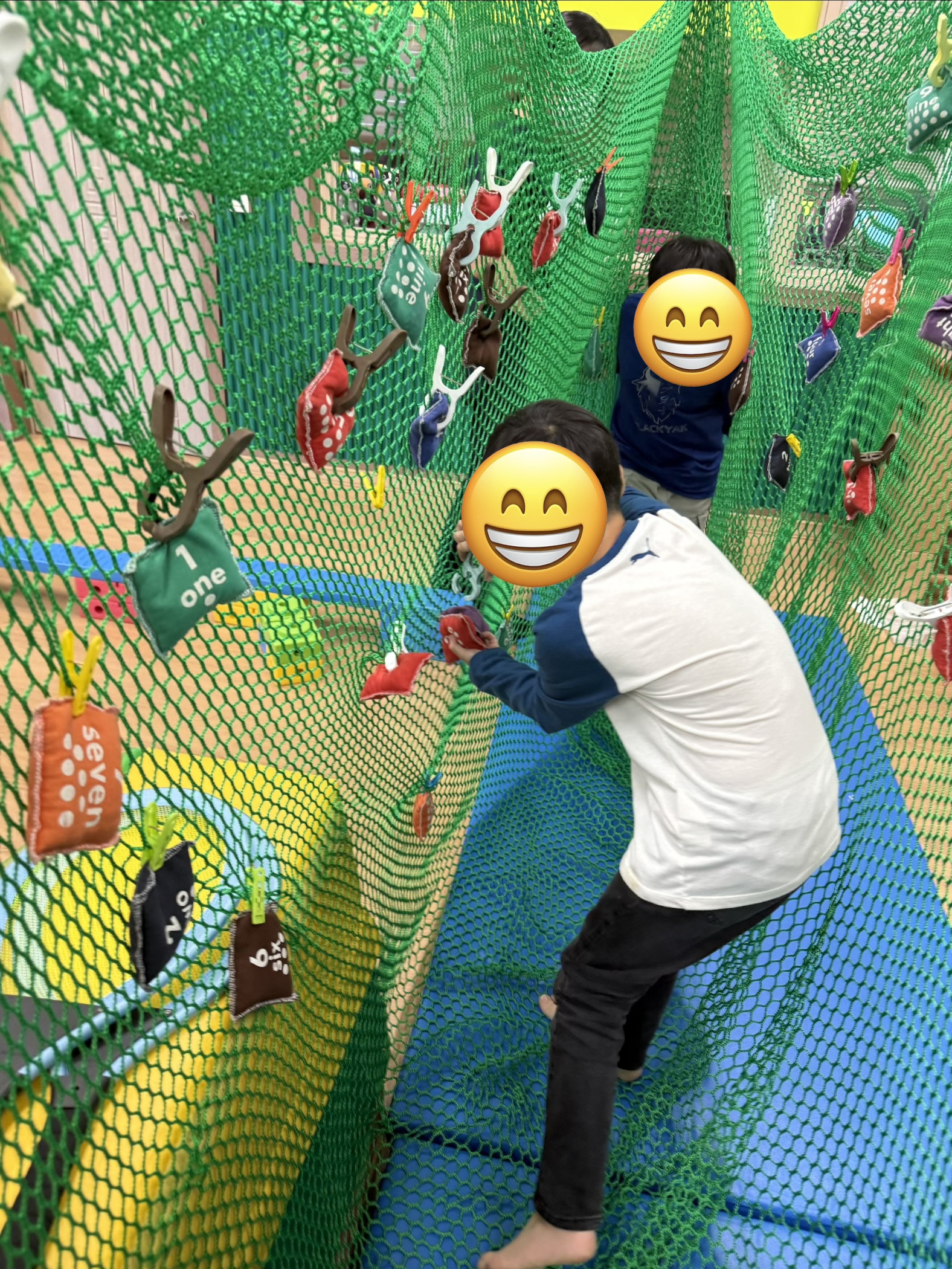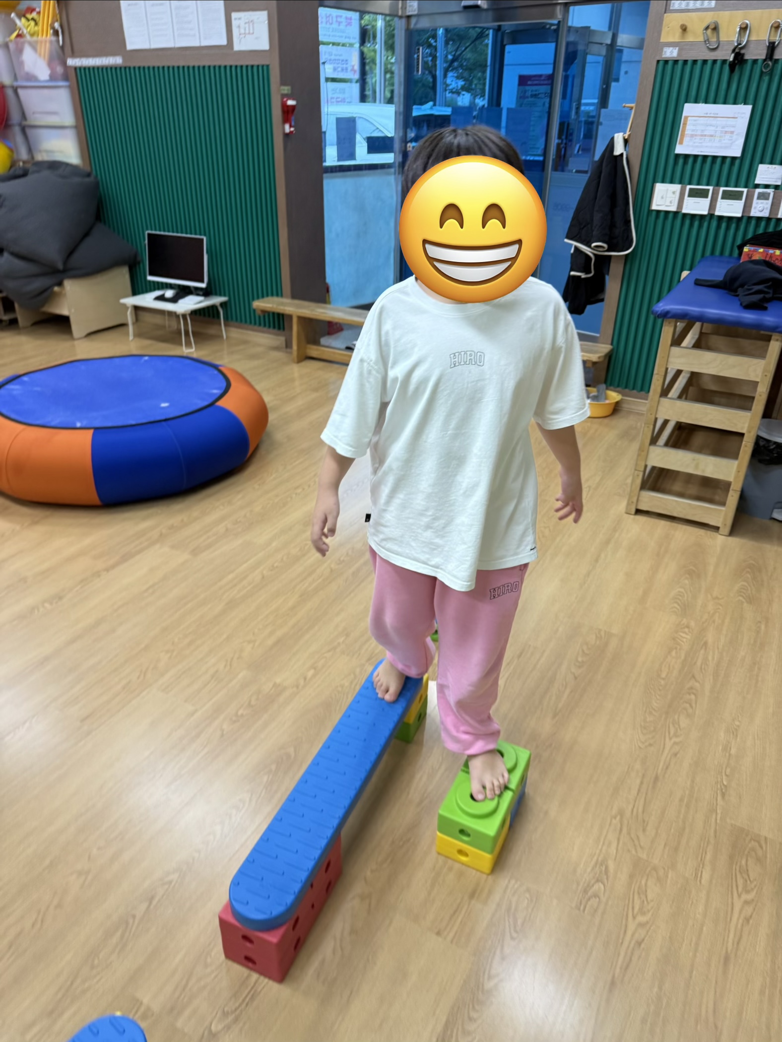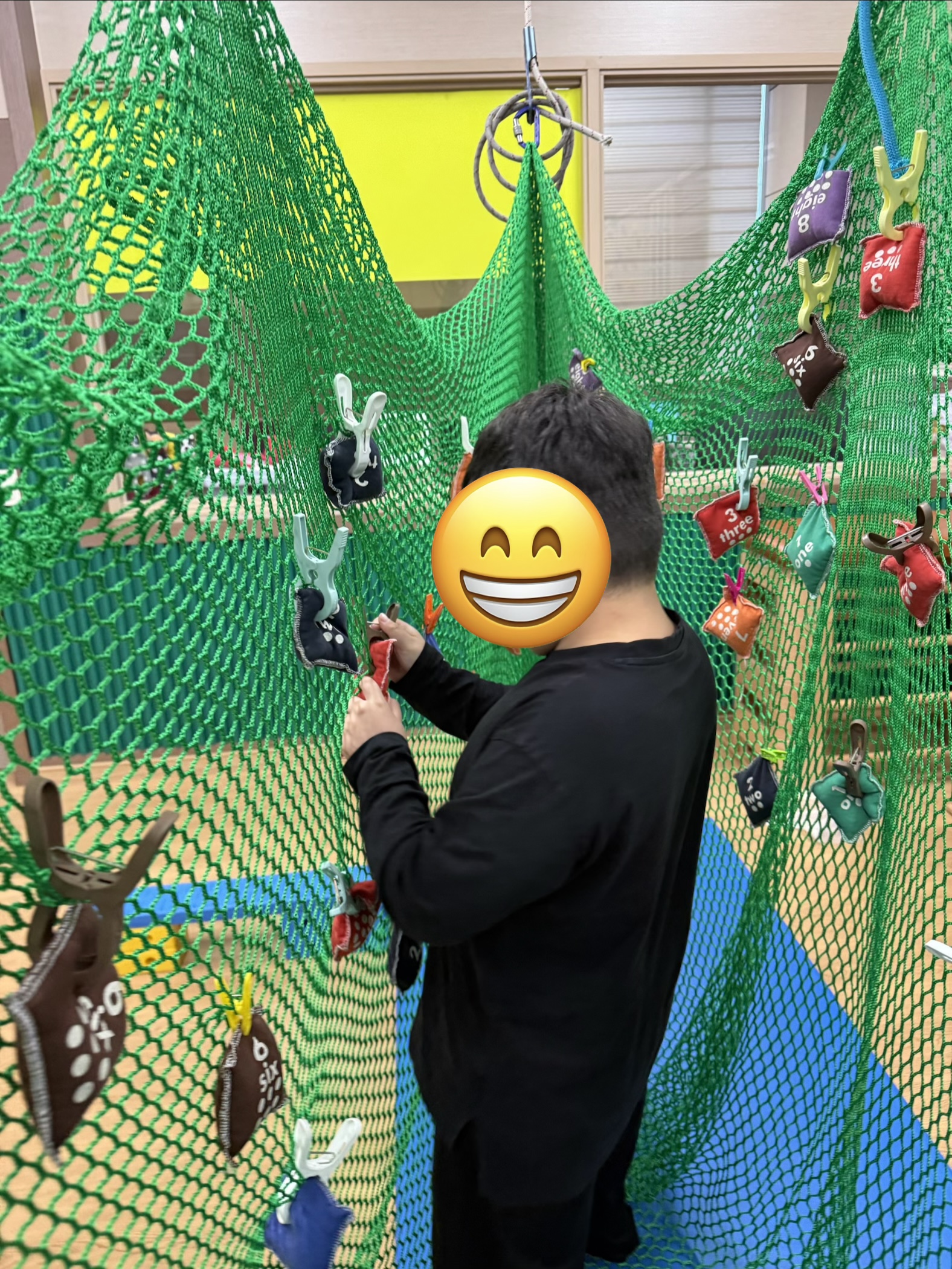 하체의 힘과 왼발-오른발의 협응을 통해 징검다리를 건너며 블럭을 이동시키고, 그물터널을 지나 모래주머니를 획득한 뒤, 배드민턴 라켓을 사용하여 자신의 위치를 인식하고 물체간의 거리조절 통해 점수판에 넣으며 목표물을 주시하는 시각집중력과 손목의 기능적인 움직임을 통한 던지기 기술을 통해 활동을 하였습니다~