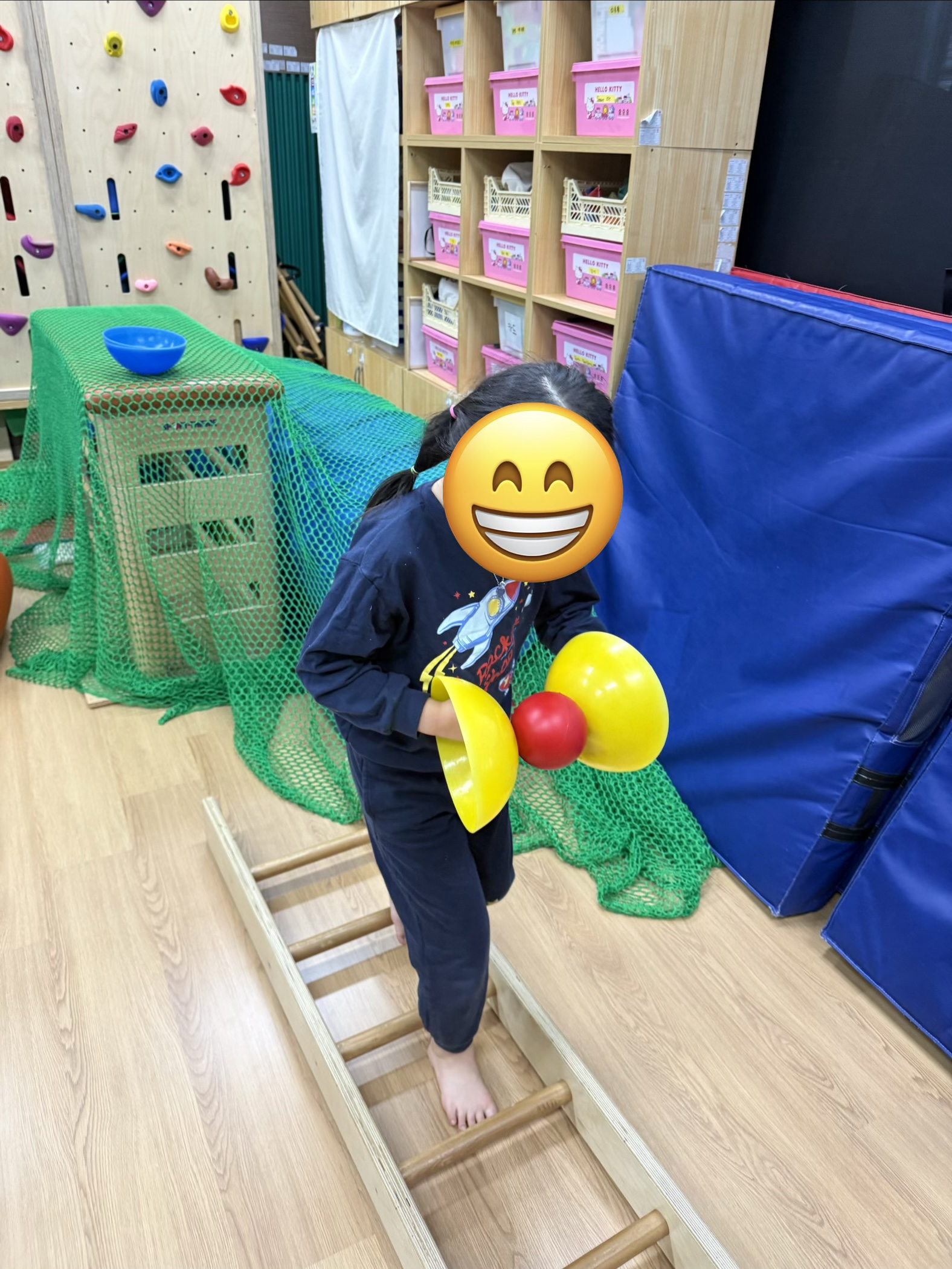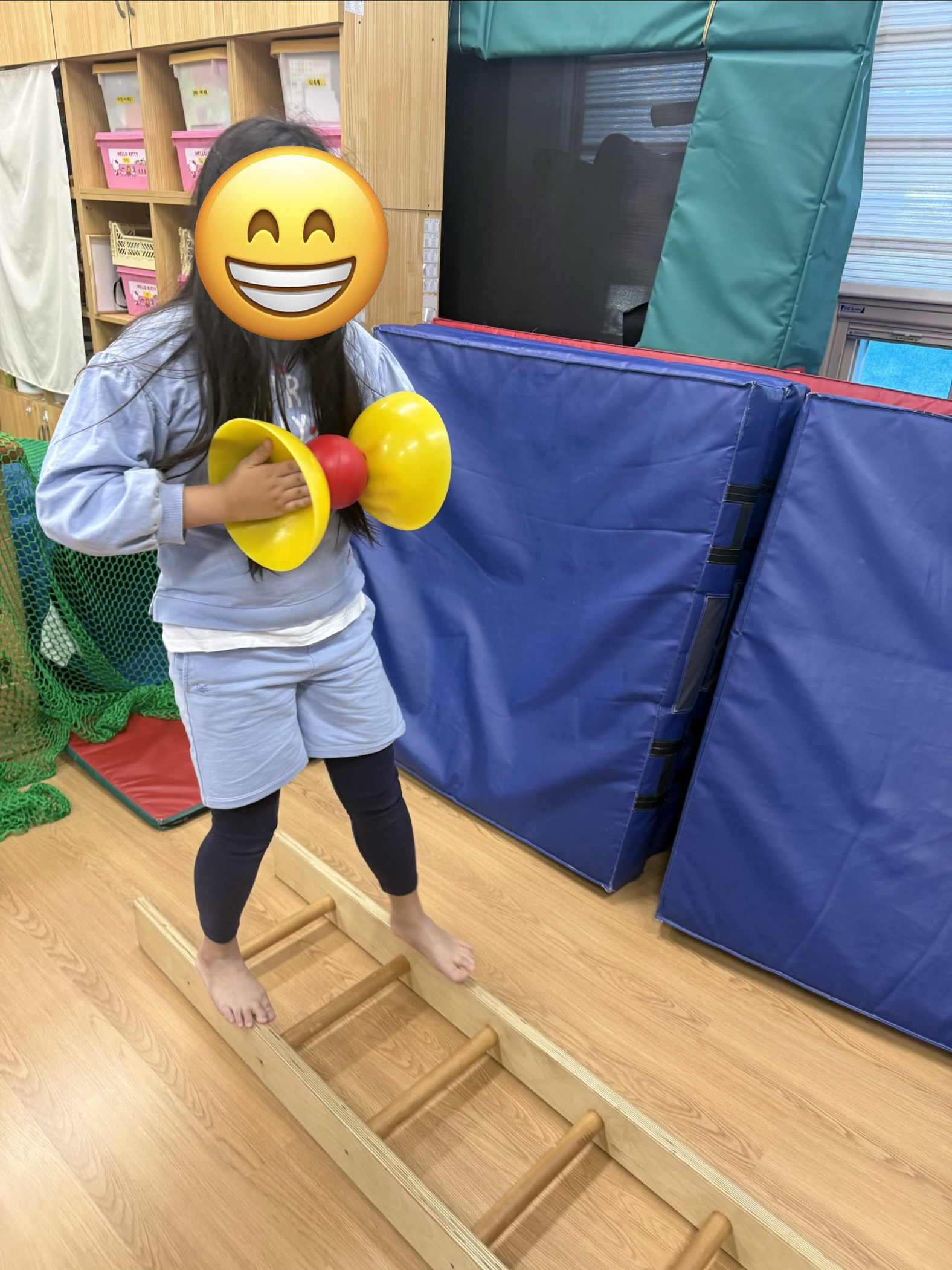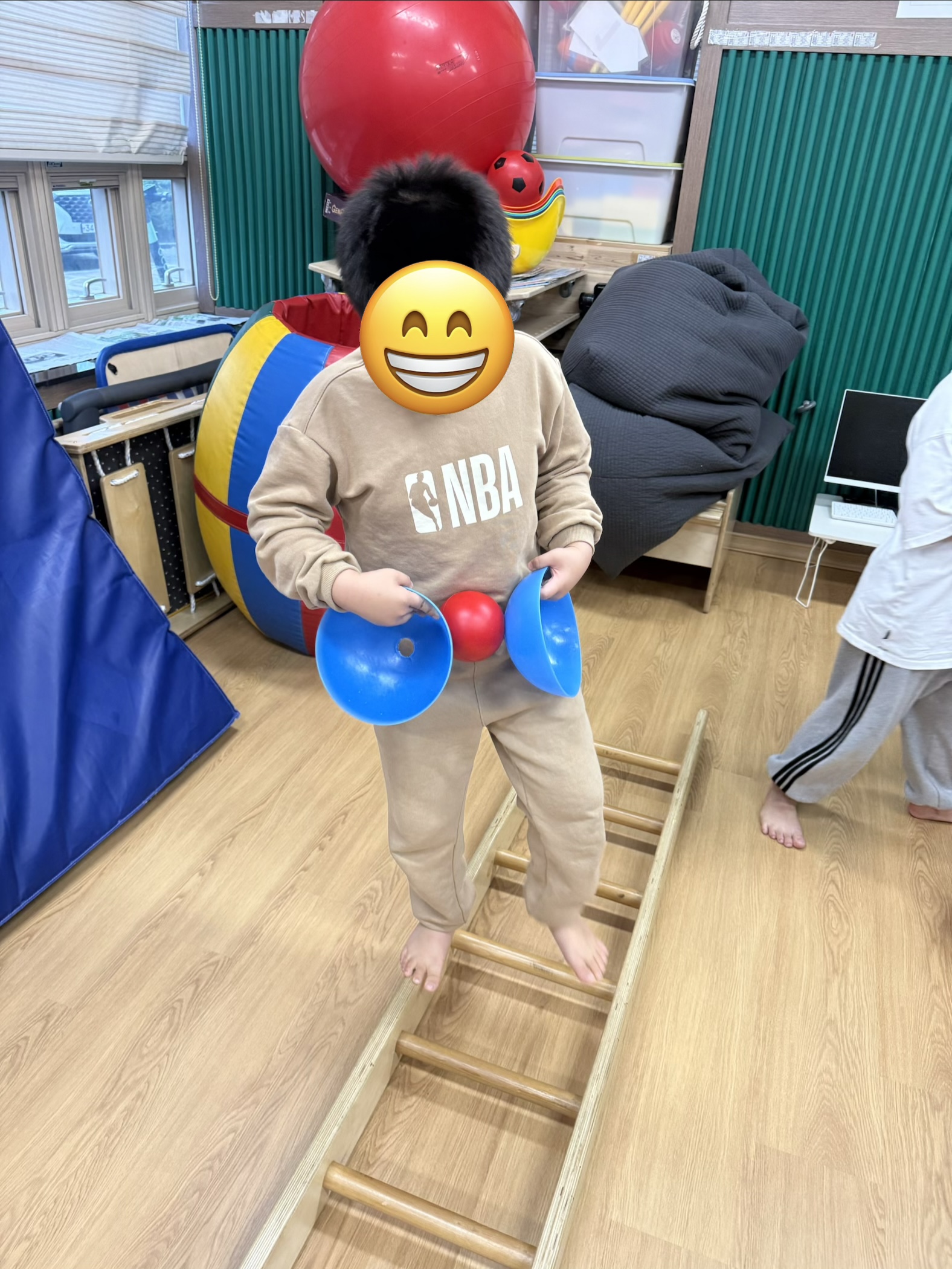 이후 꼬깔에서 가져온 공을 접시콘으로 잡고 이동하며 두손의 협응과 소근육의 힘조절력을 키우며 사다리 위에서도 균형조절하여 건너가면서 자연스럽게 두가지 과제를 동시에 수행할 수 있도록 했습니다~