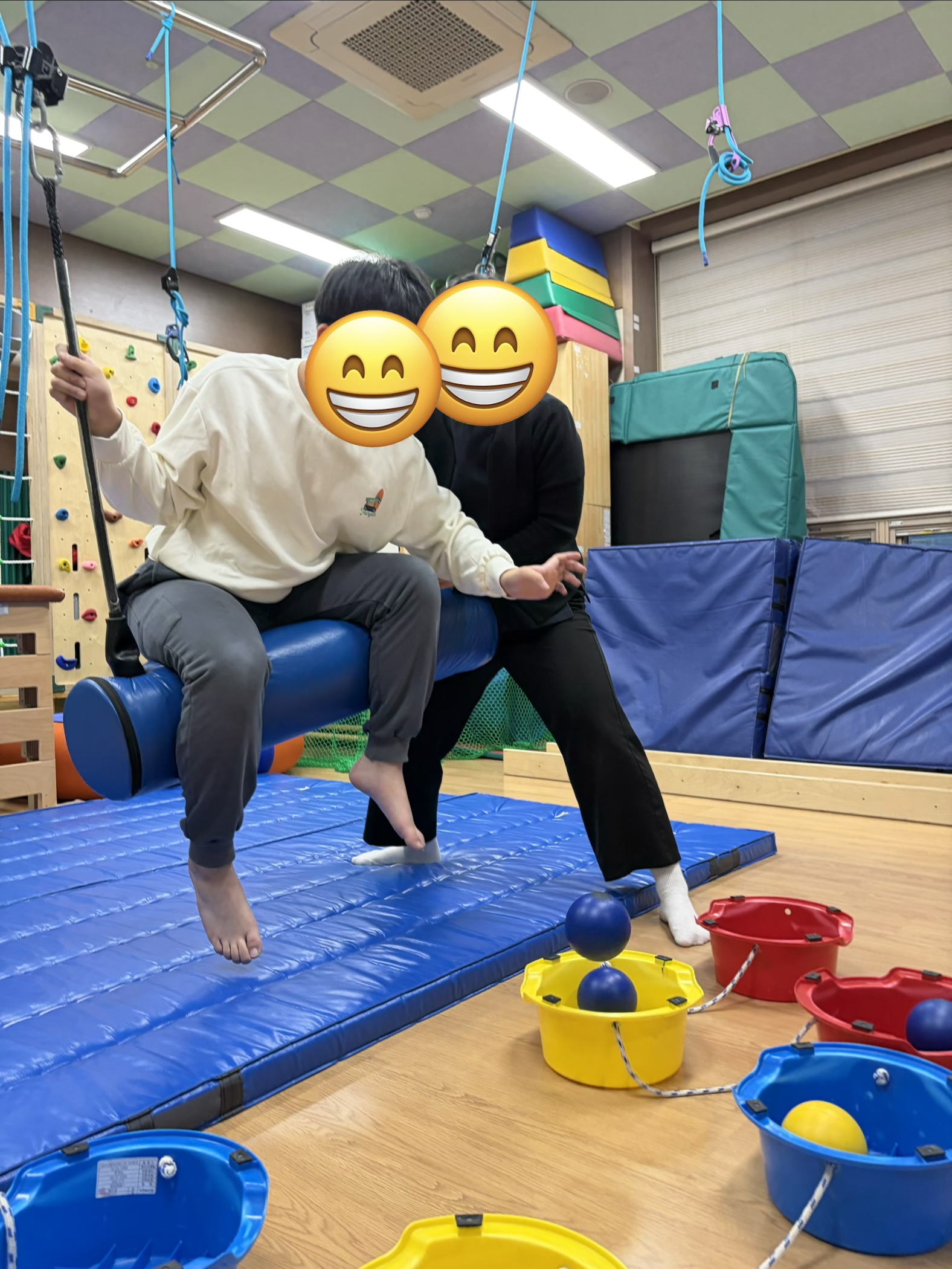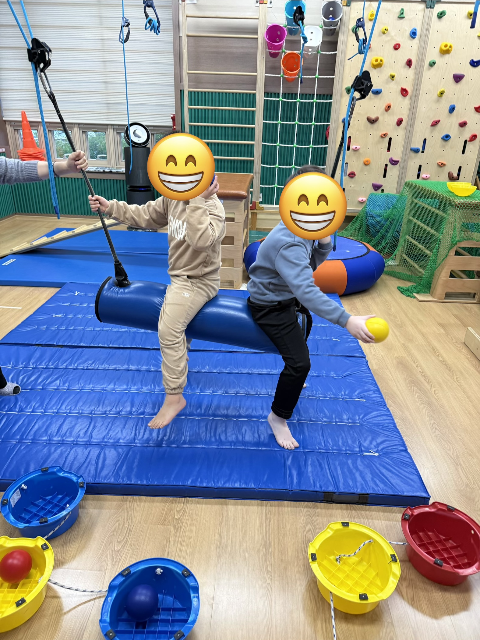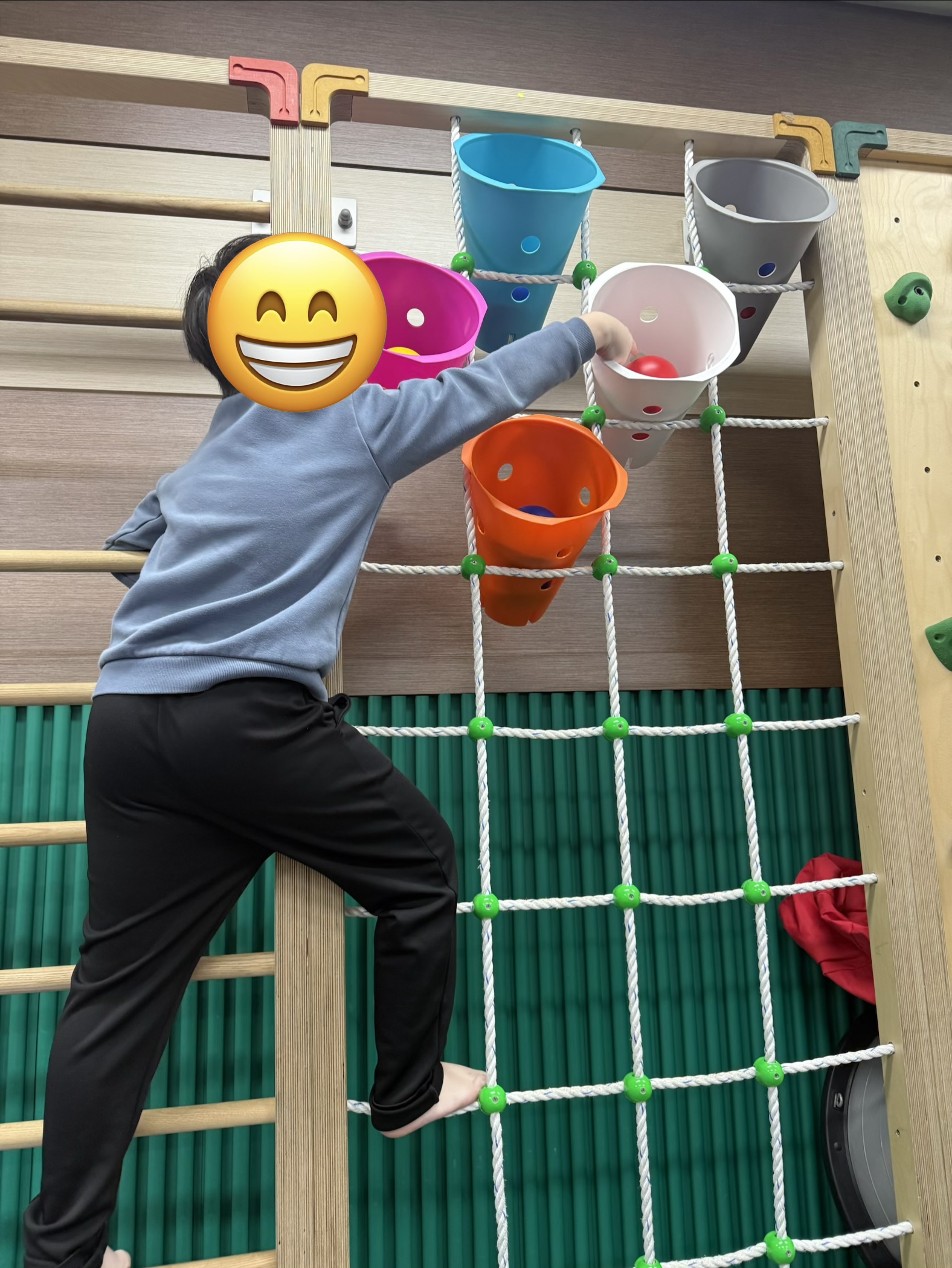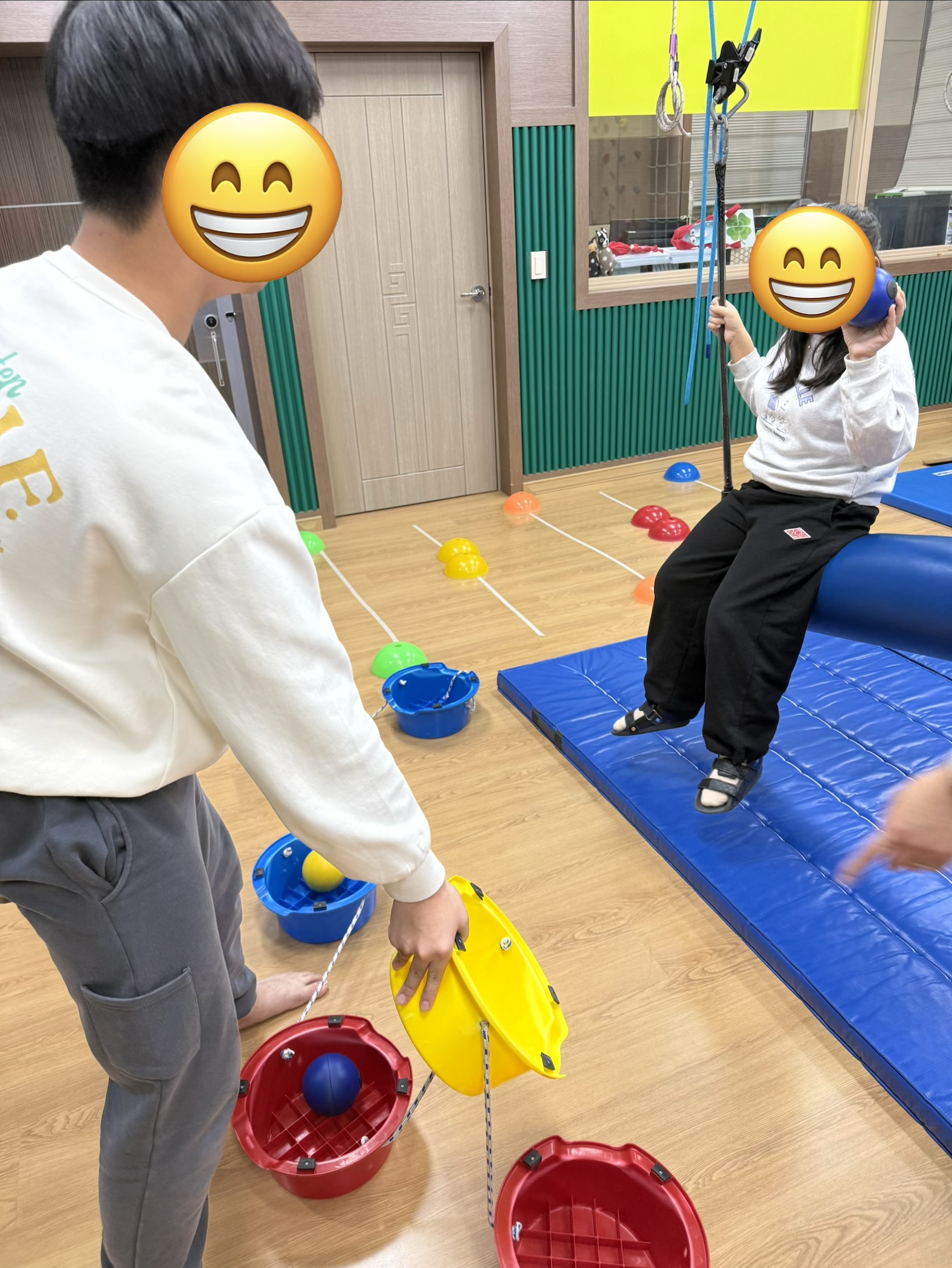 이후 꼬깔에서 가져온 공을 접시콘으로 잡고 이동하며 두손의 협응과 소근육의 힘조절력을 키우며 사다리 위에서도 균형조절하여 건너가면서 자연스럽게 두가지 과제를 동시에 수행할 수 있도록 했습니다~