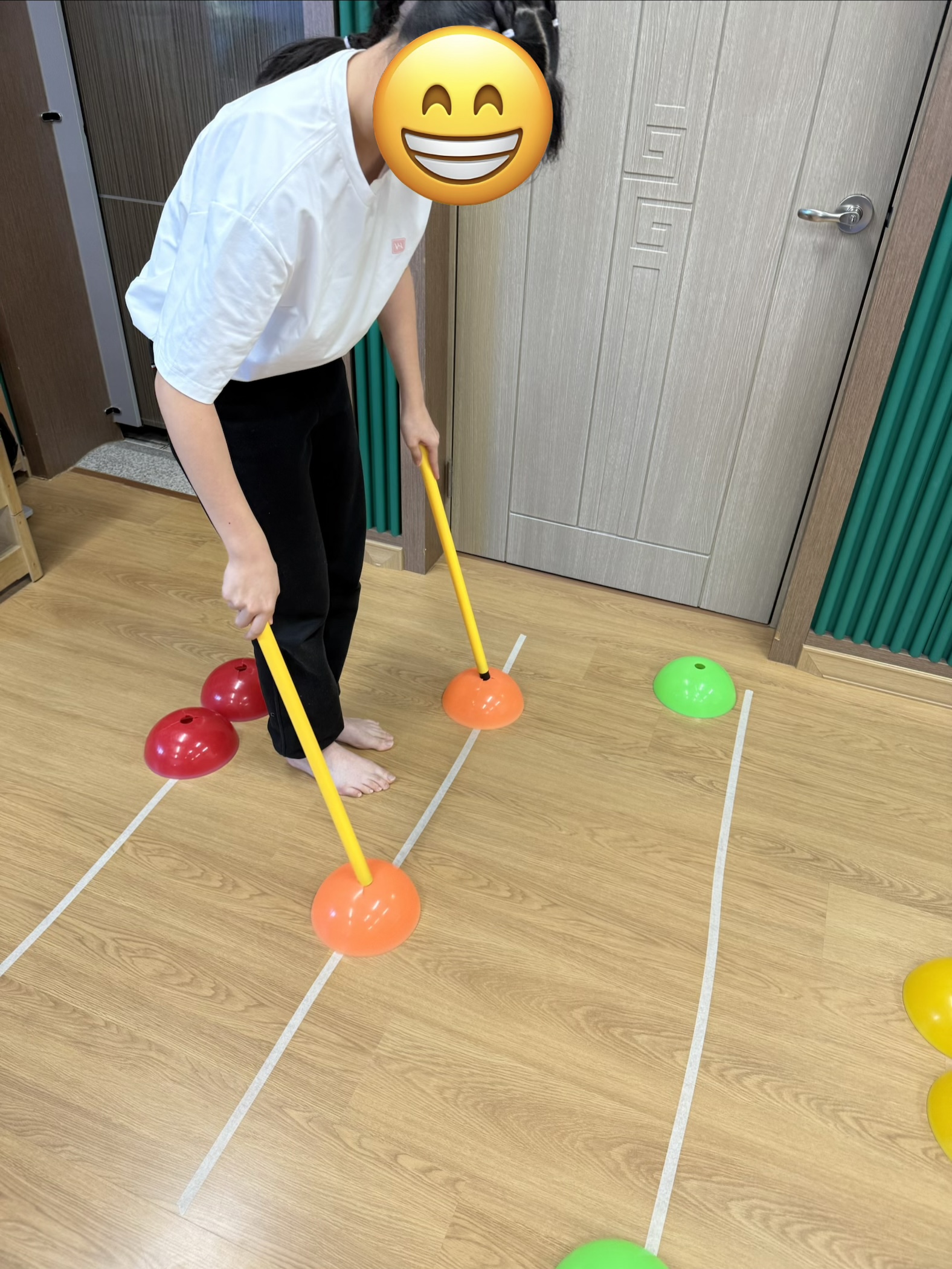 시각 정보를 바탕으로 시지각 처리와 두손의 협응을 통해 접시콘의 구멍에 막대를 끼워서 선을 따라 모으며, 모인 접시콘은 끝으로 이동시키는 활동을 하였고,