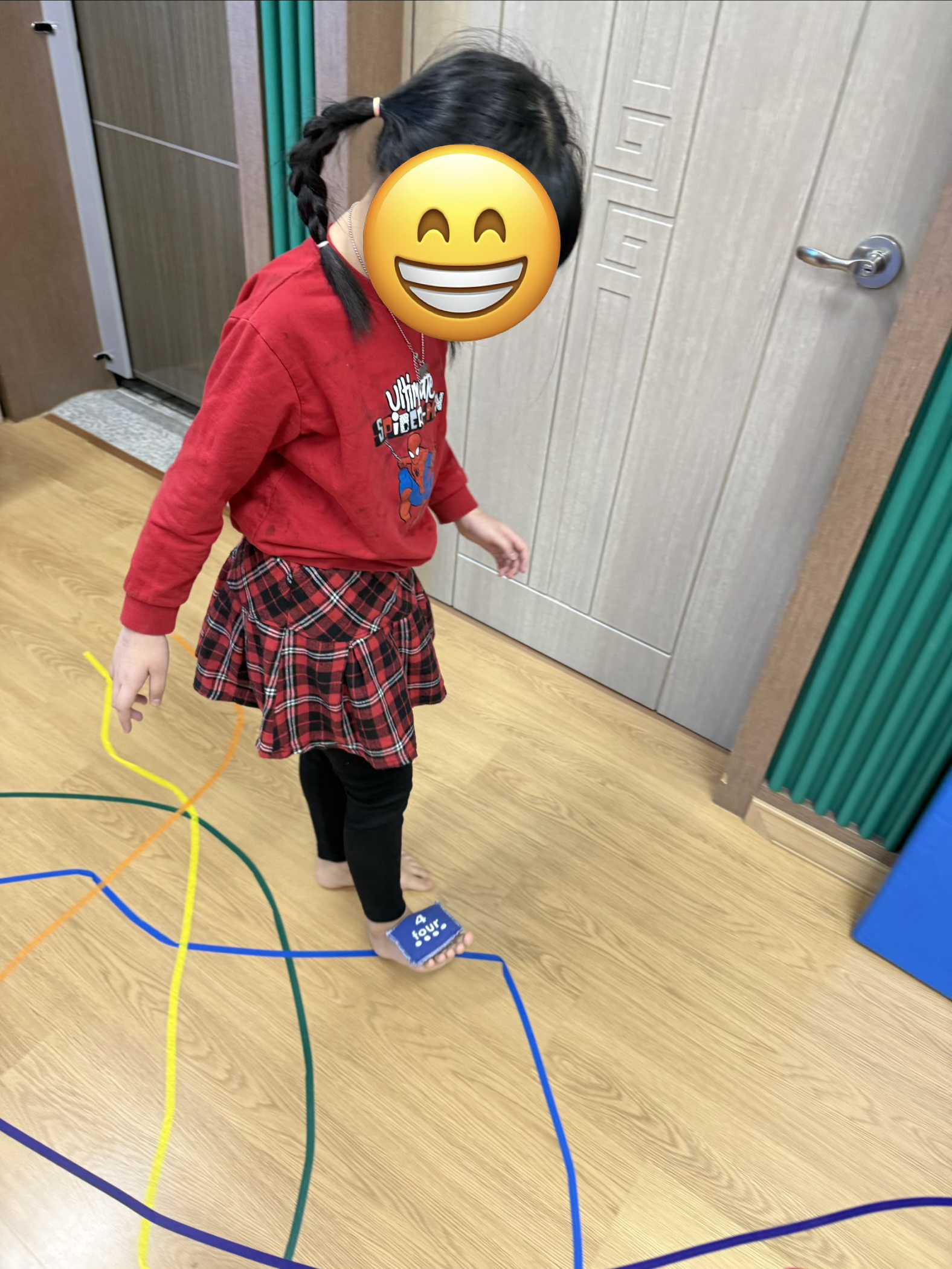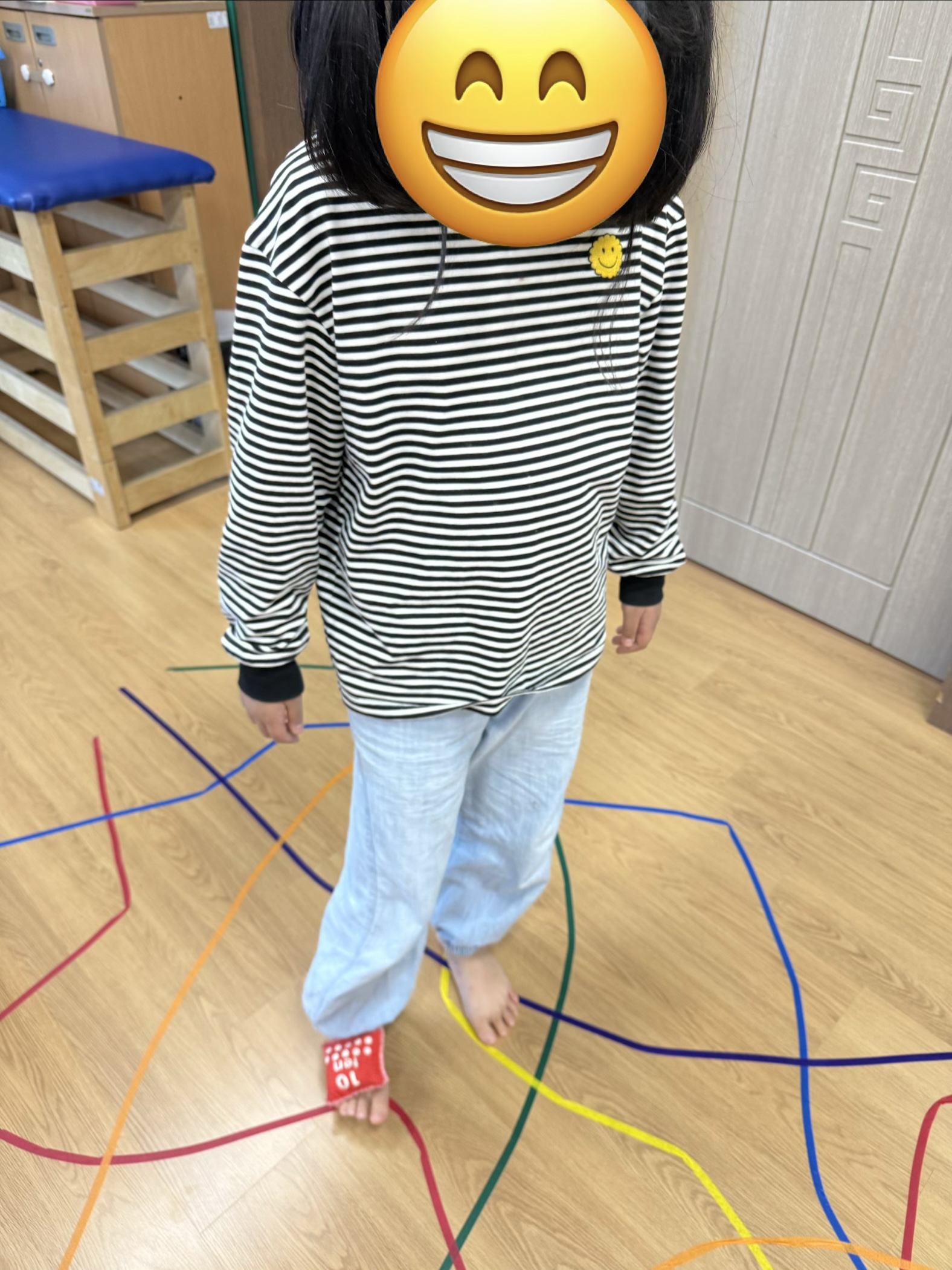 오재미를 찾아 발등 위에 올려 일치하는 색의 테이핑 길을 따라 떨어트리지 않고 이동하여 눈과발의 협응, 코어근육 강화, 체간 및 발의 움직임 조절을 통해 같은색 바구니에 넣어요~