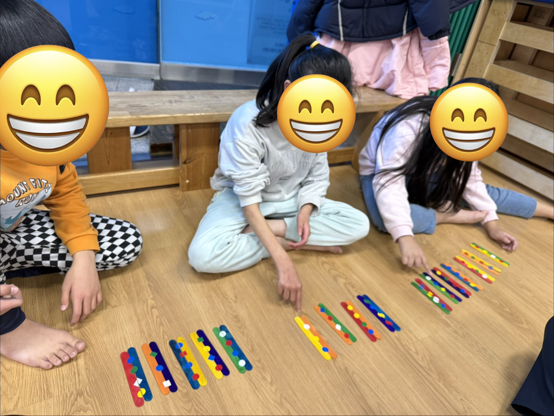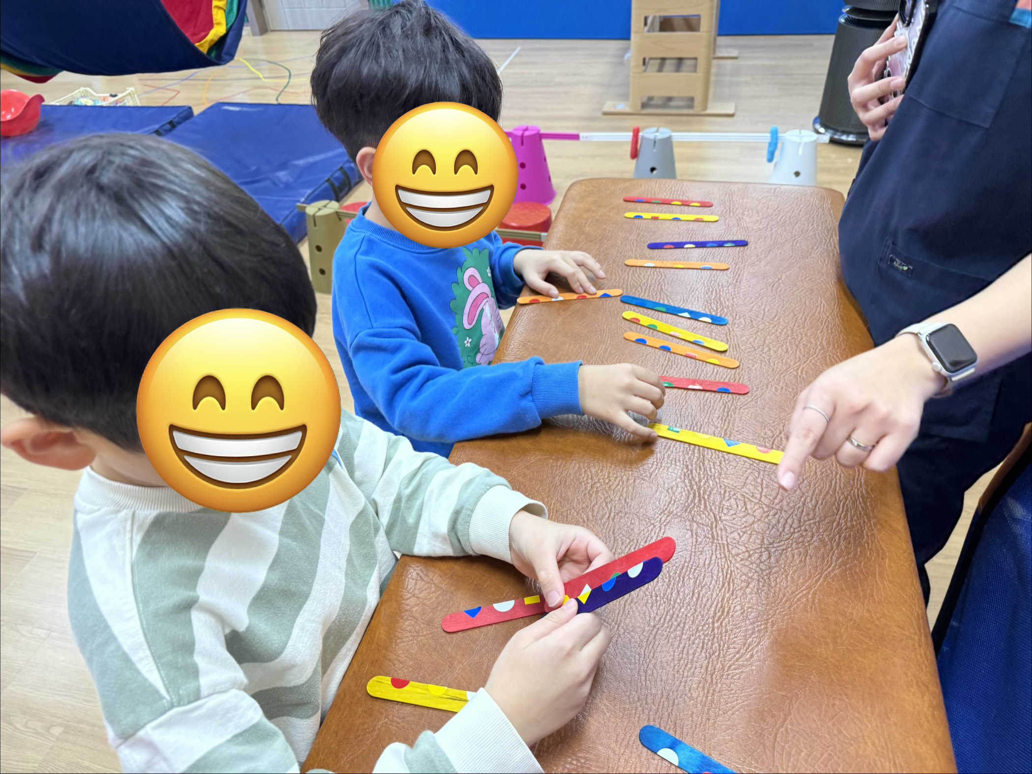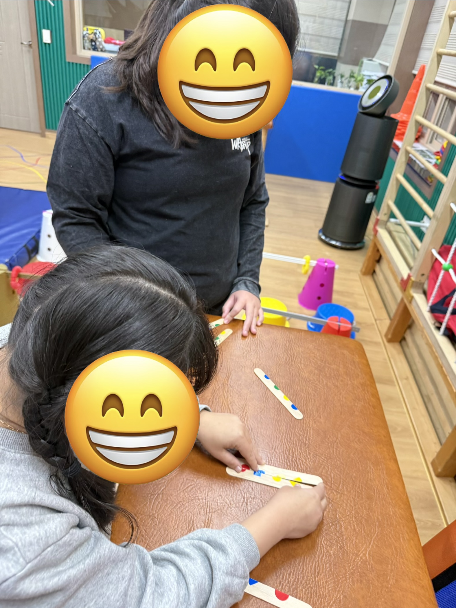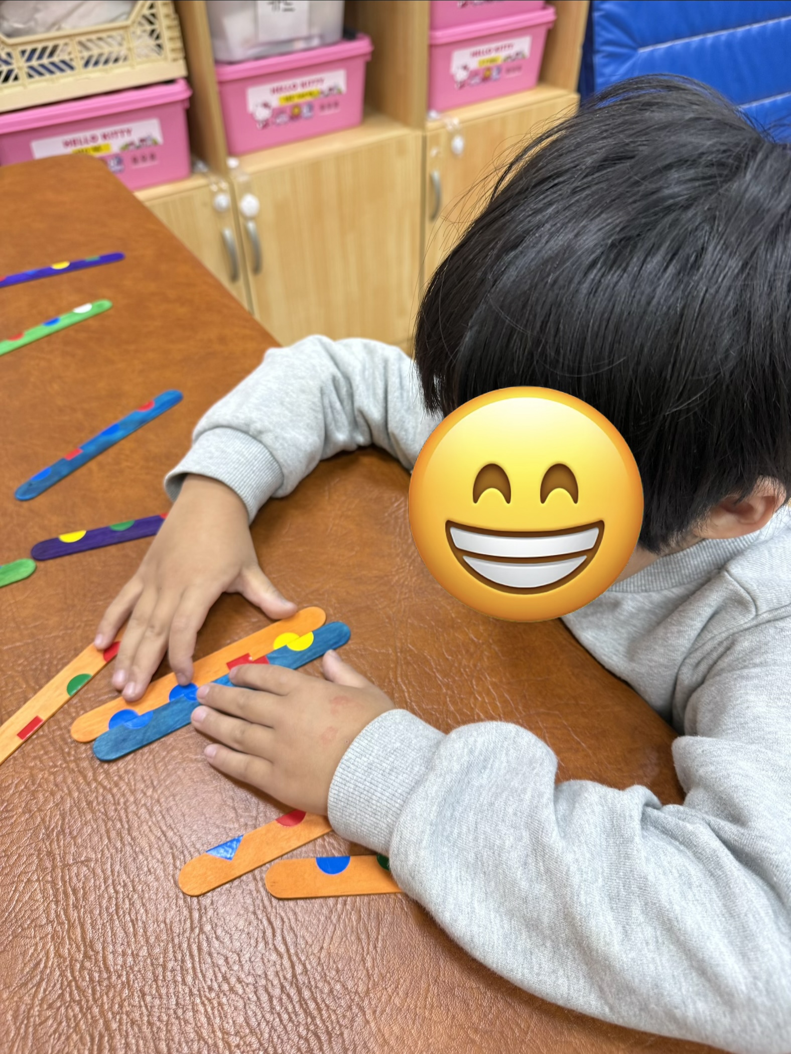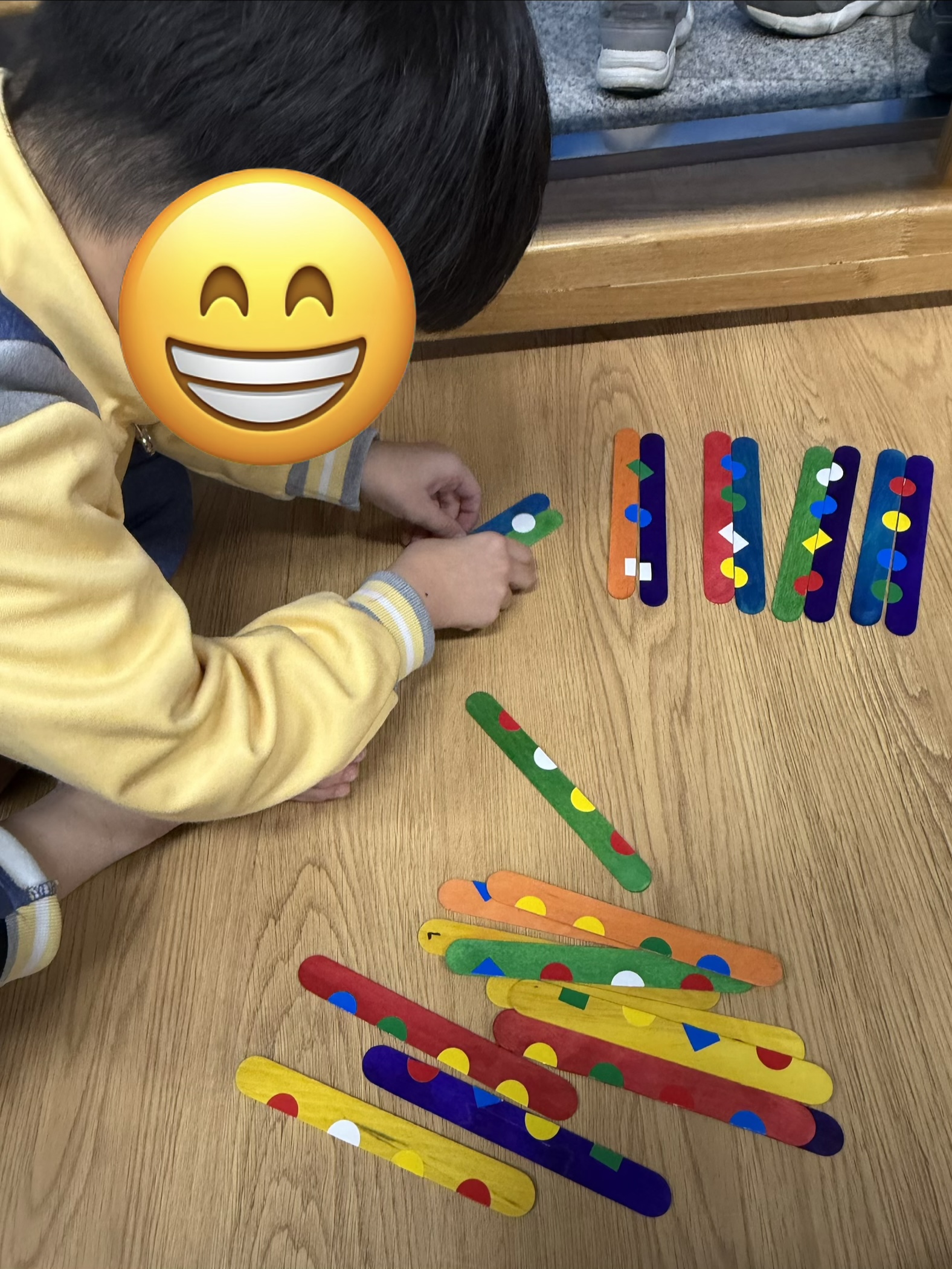 하드바에 그려진 동그라미, 네모, 세모의 도형의 형태를 인식하여 막대퍼즐 조각을 한개 가지고 이동하여 반대쪽 퍼즐조각까지 찾아서 완성해보는 시지각활동으로 도형의 형태인식과 색깔 변별향상을 위한 활동을 하였습니다~