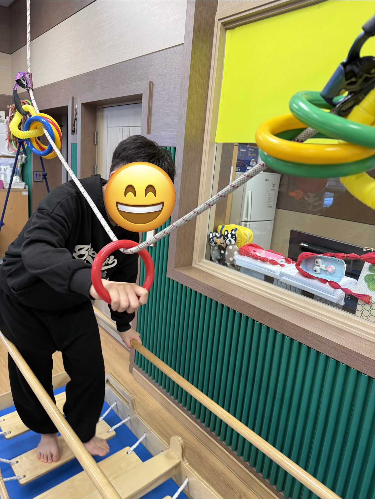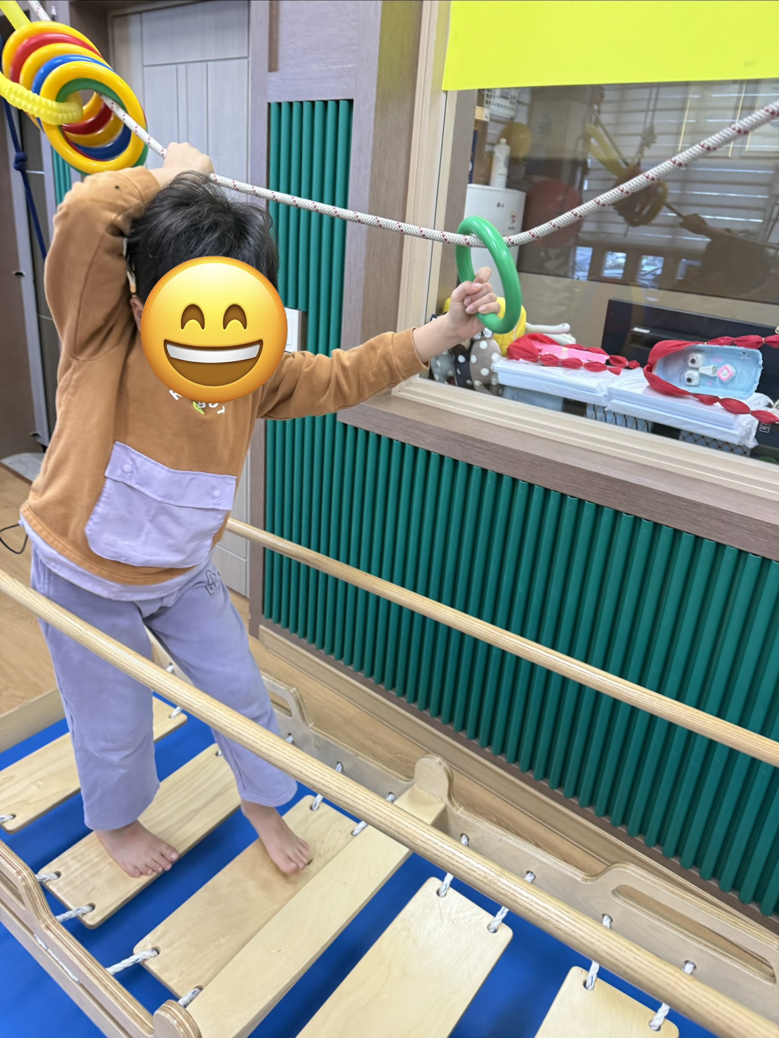 징검다리 그네 위에서 균형조절을 통해 고리를 반대편에 이동시켜
