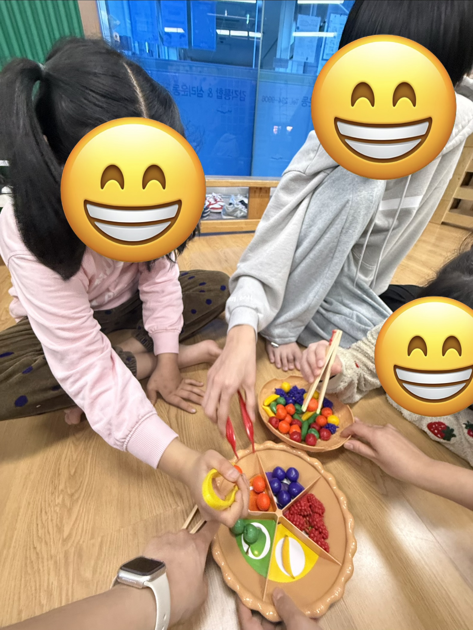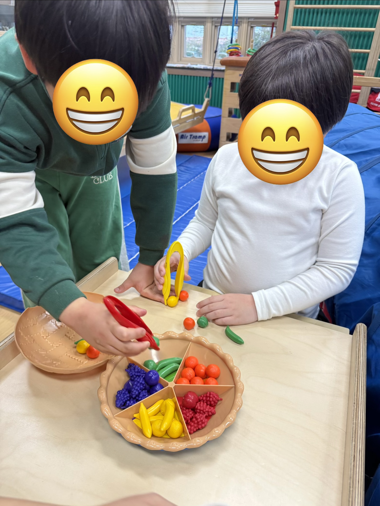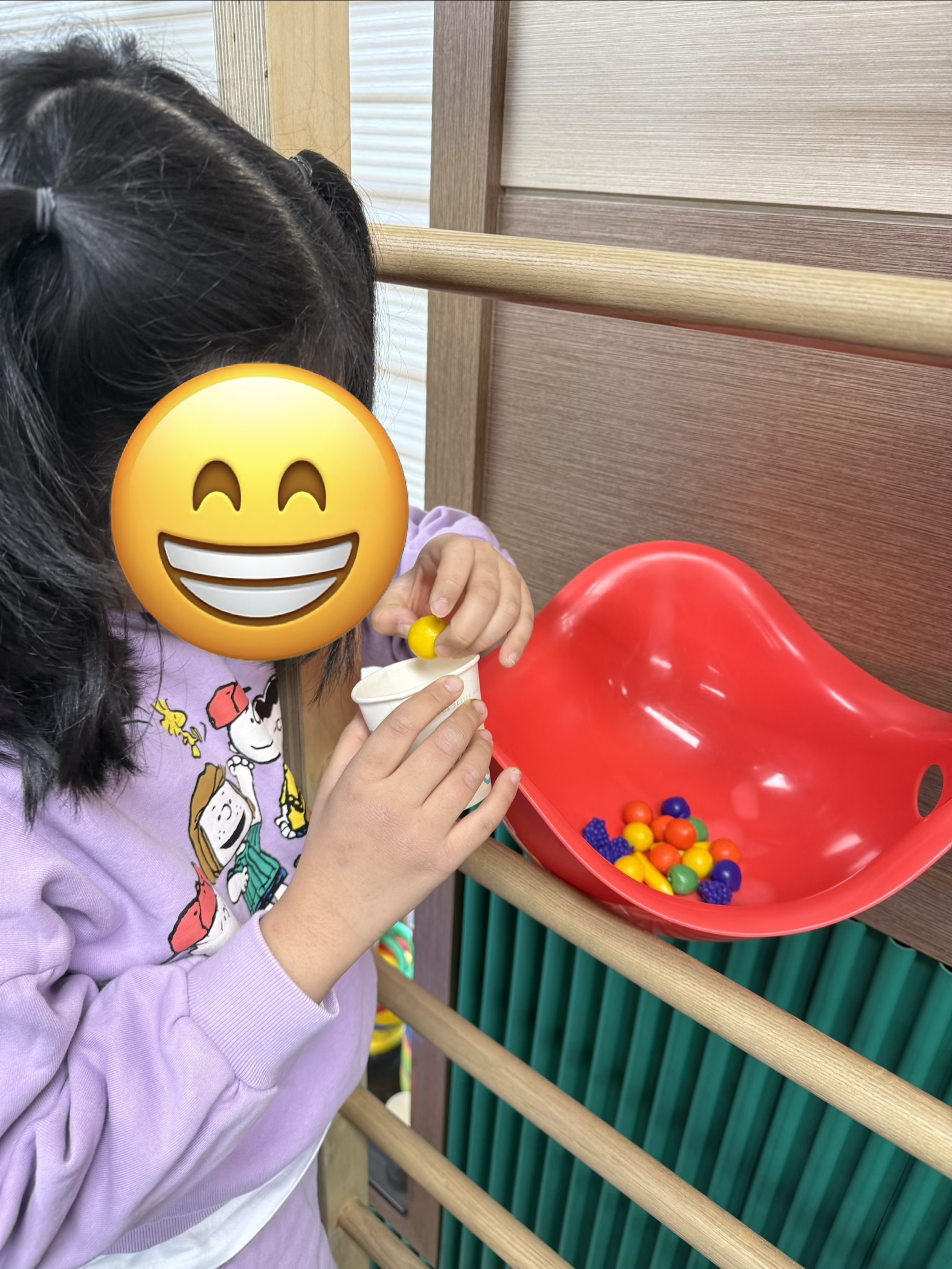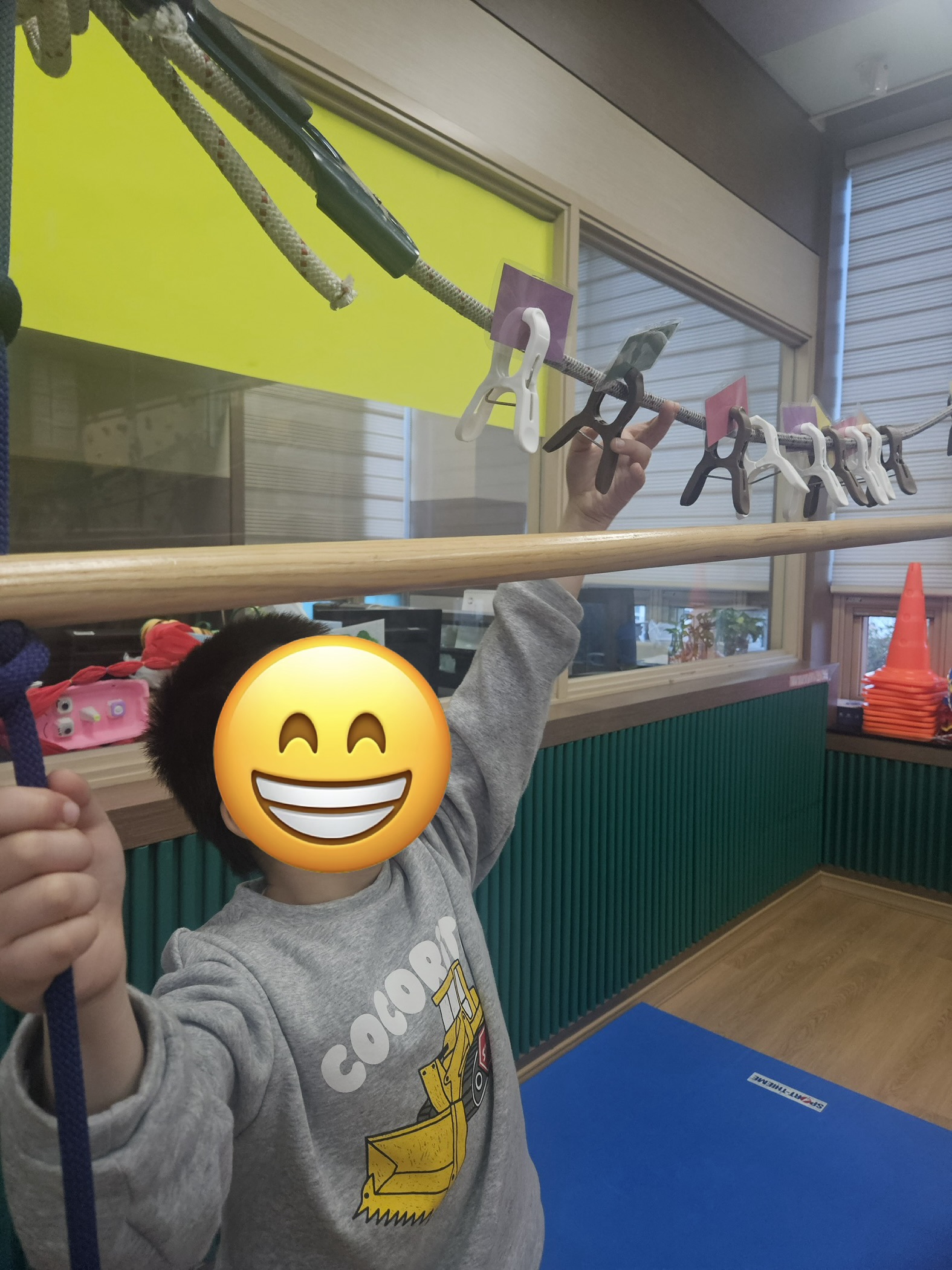 그네 위에 걸린 다양한 색 카드를 가지고 늑목사다리까지 올라간 뒤, 카드와 같은 색 과일들을 찾아서 그릇에 표시된 색깔에 따라 집게로 과일을 분류해보는 것으로 색 구분과 과일 변별력 증진, 소근육 조절에 도움이 되고자 활동 진행하였습니다~
