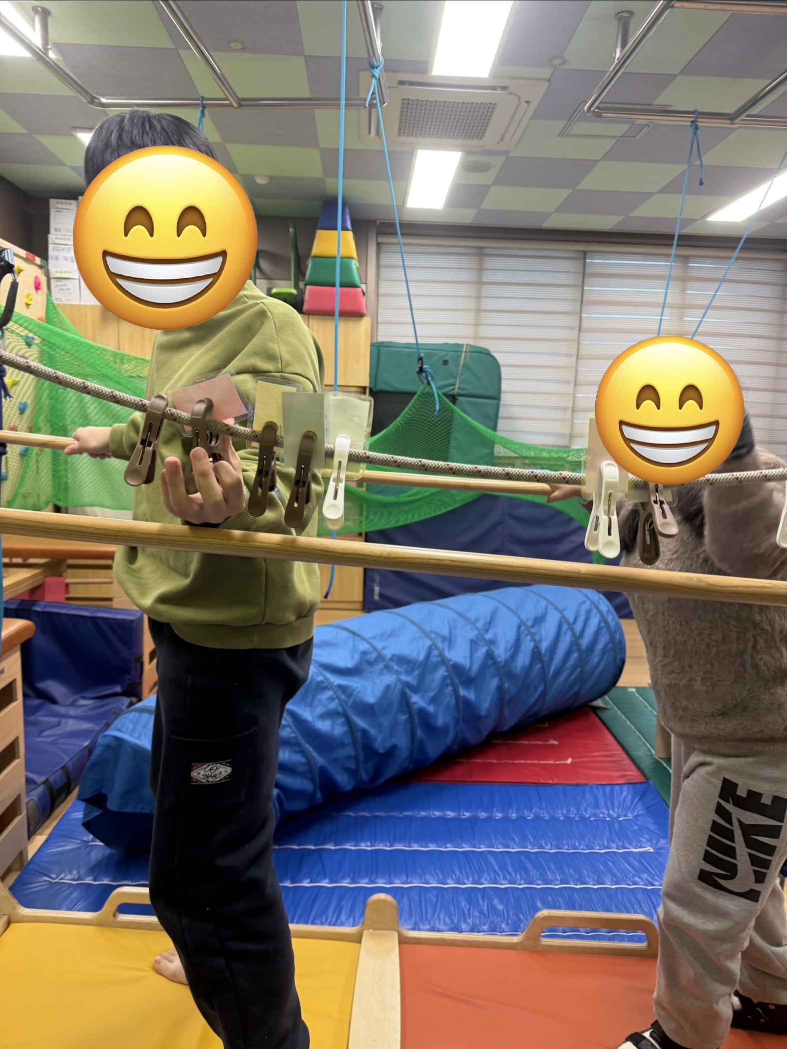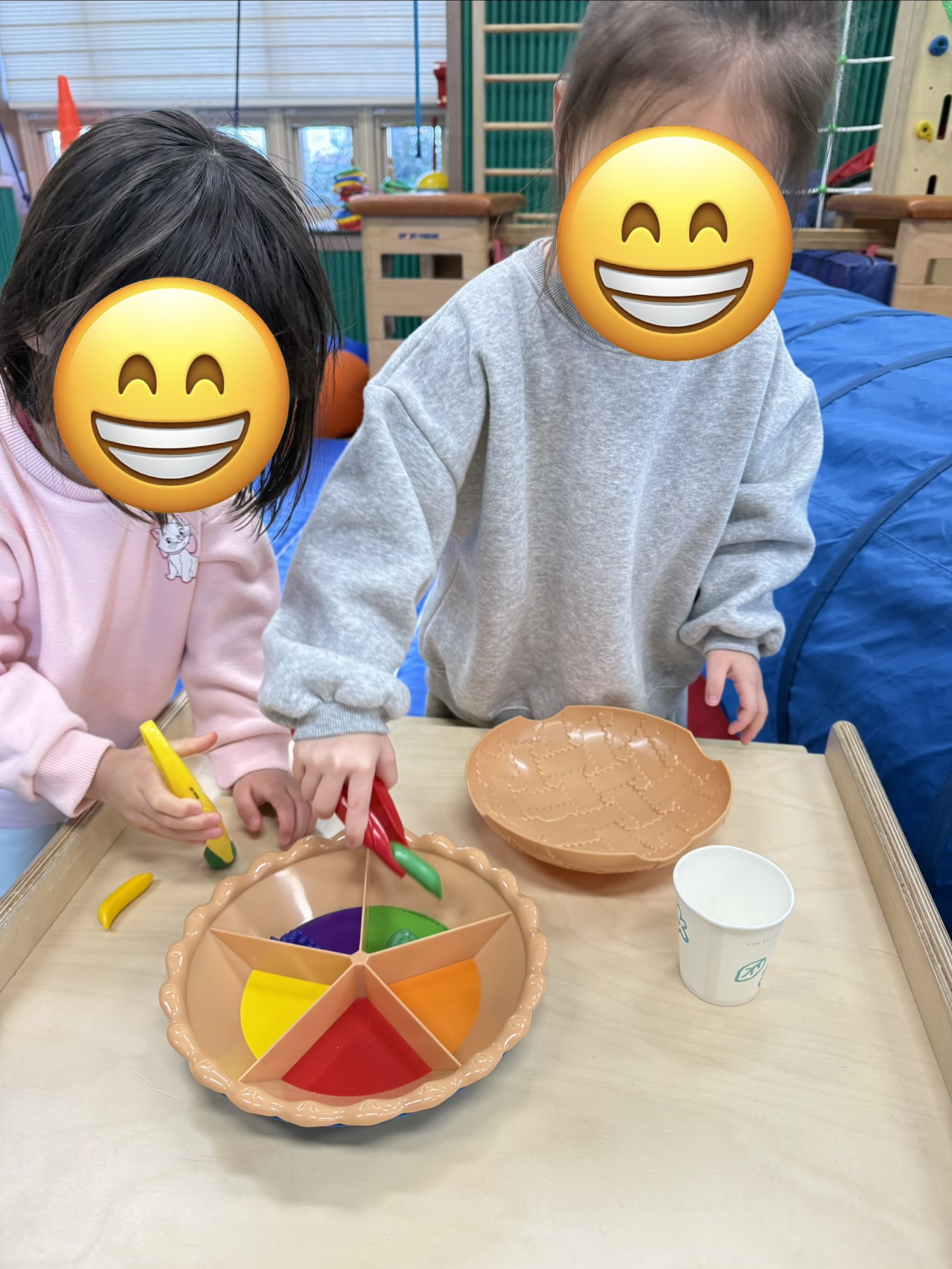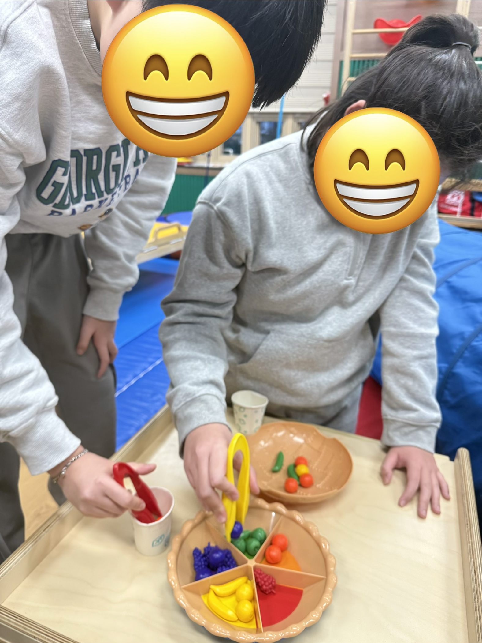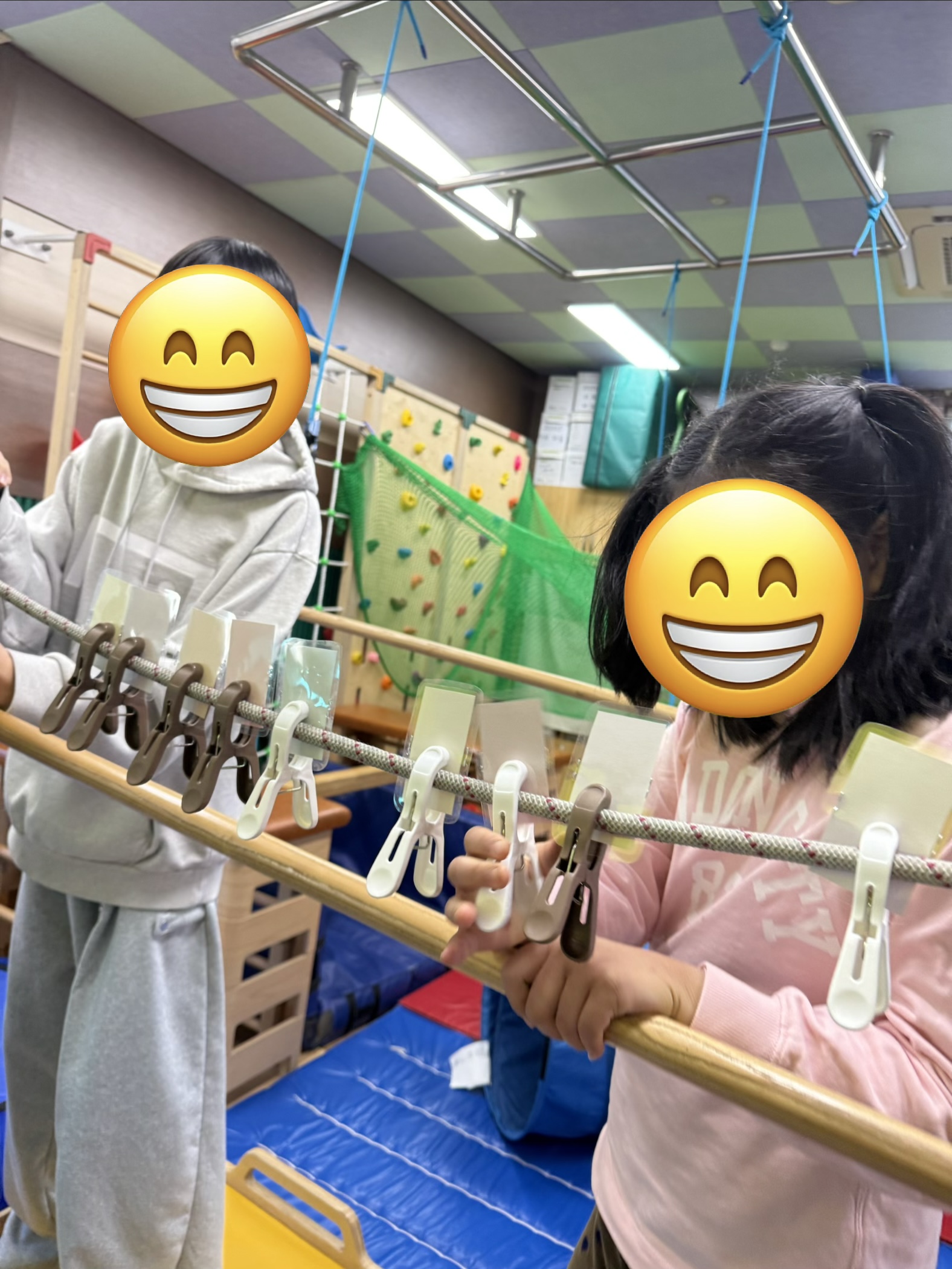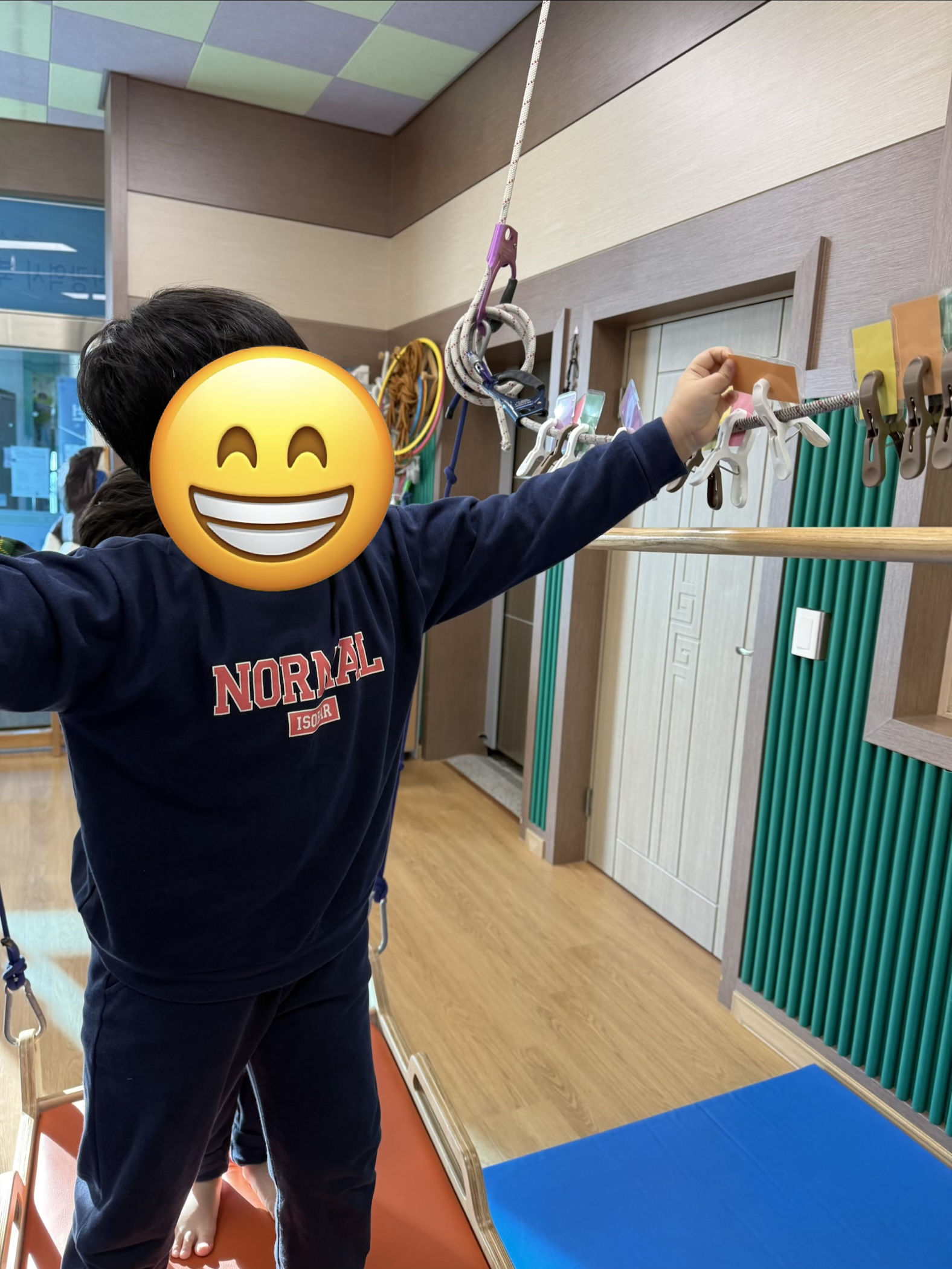 그네 위에 걸린 다양한 색 카드를 가지고 늑목사다리까지 올라간 뒤, 카드와 같은 색 과일들을 찾아서 그릇에 표시된 색깔에 따라 집게로 과일을 분류해보는 것으로 색 구분과 과일 변별력 증진, 소근육 조절에 도움이 되고자 활동 진행하였습니다~