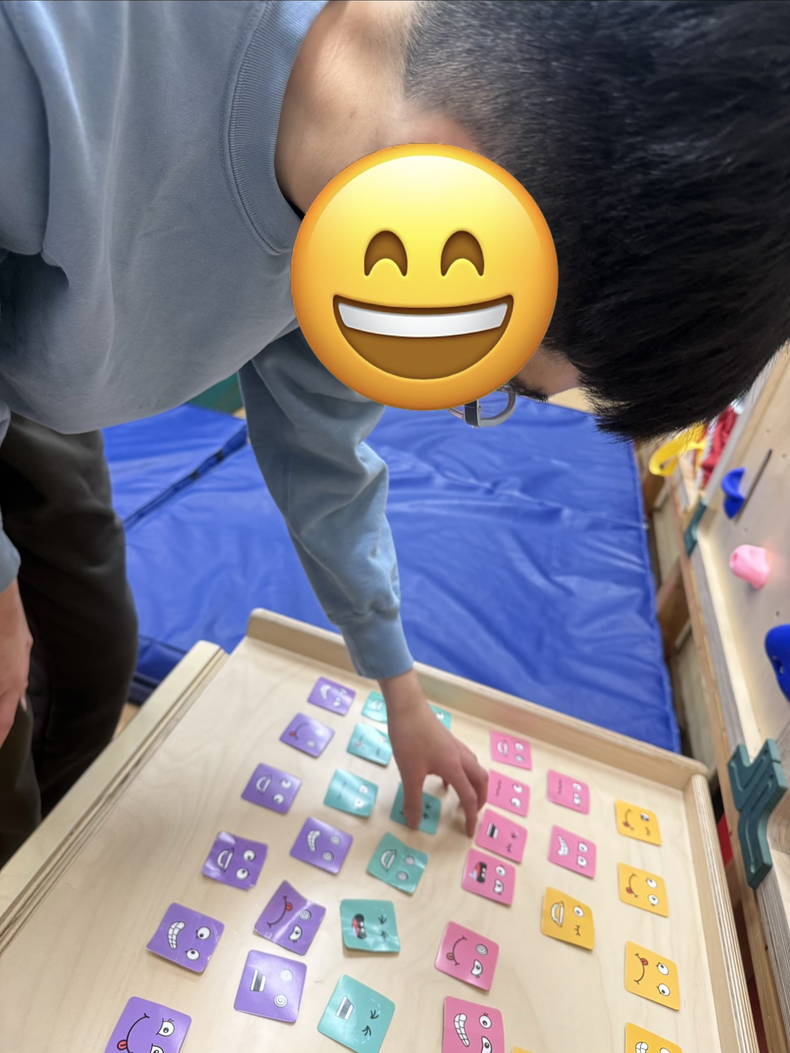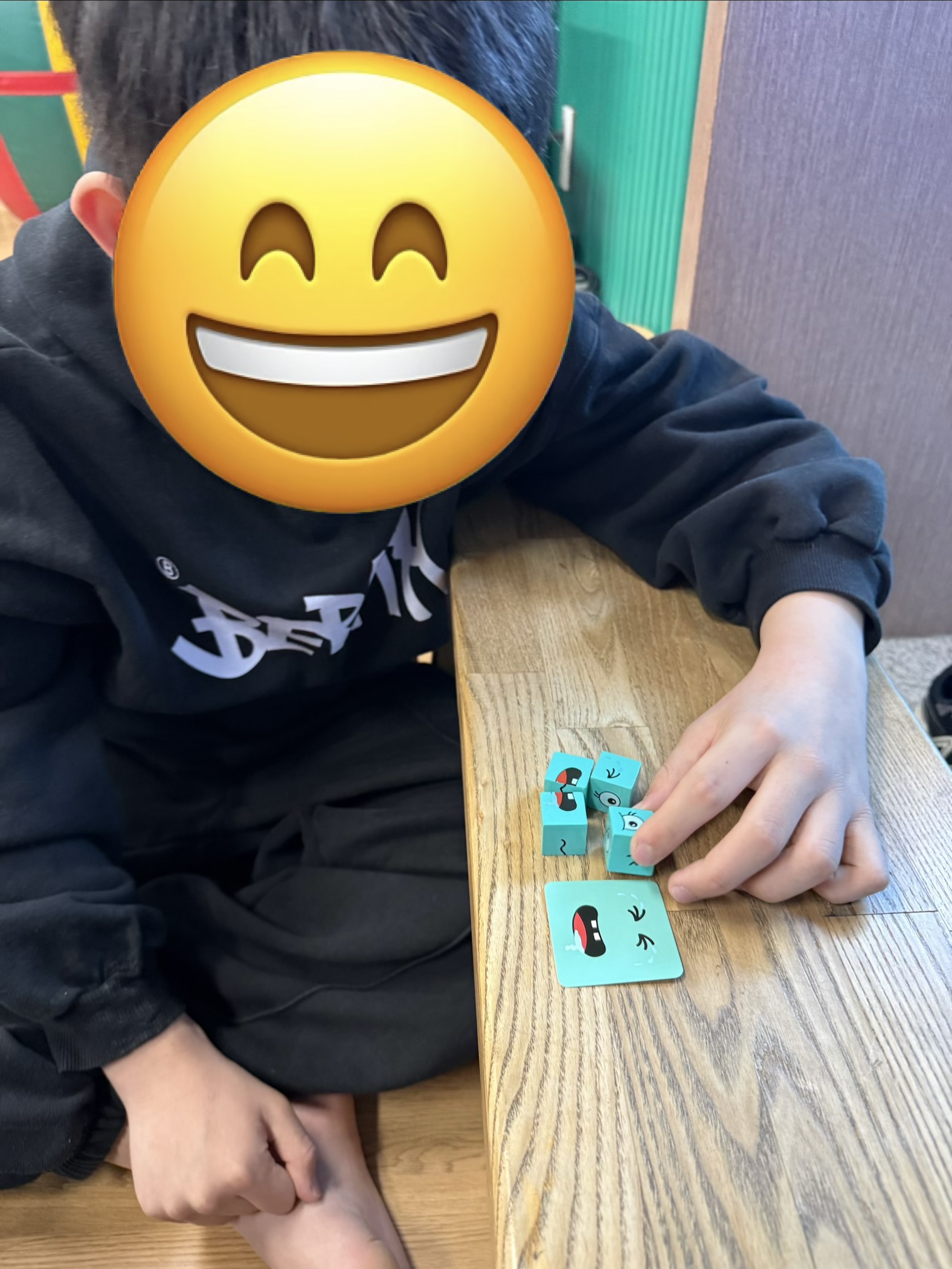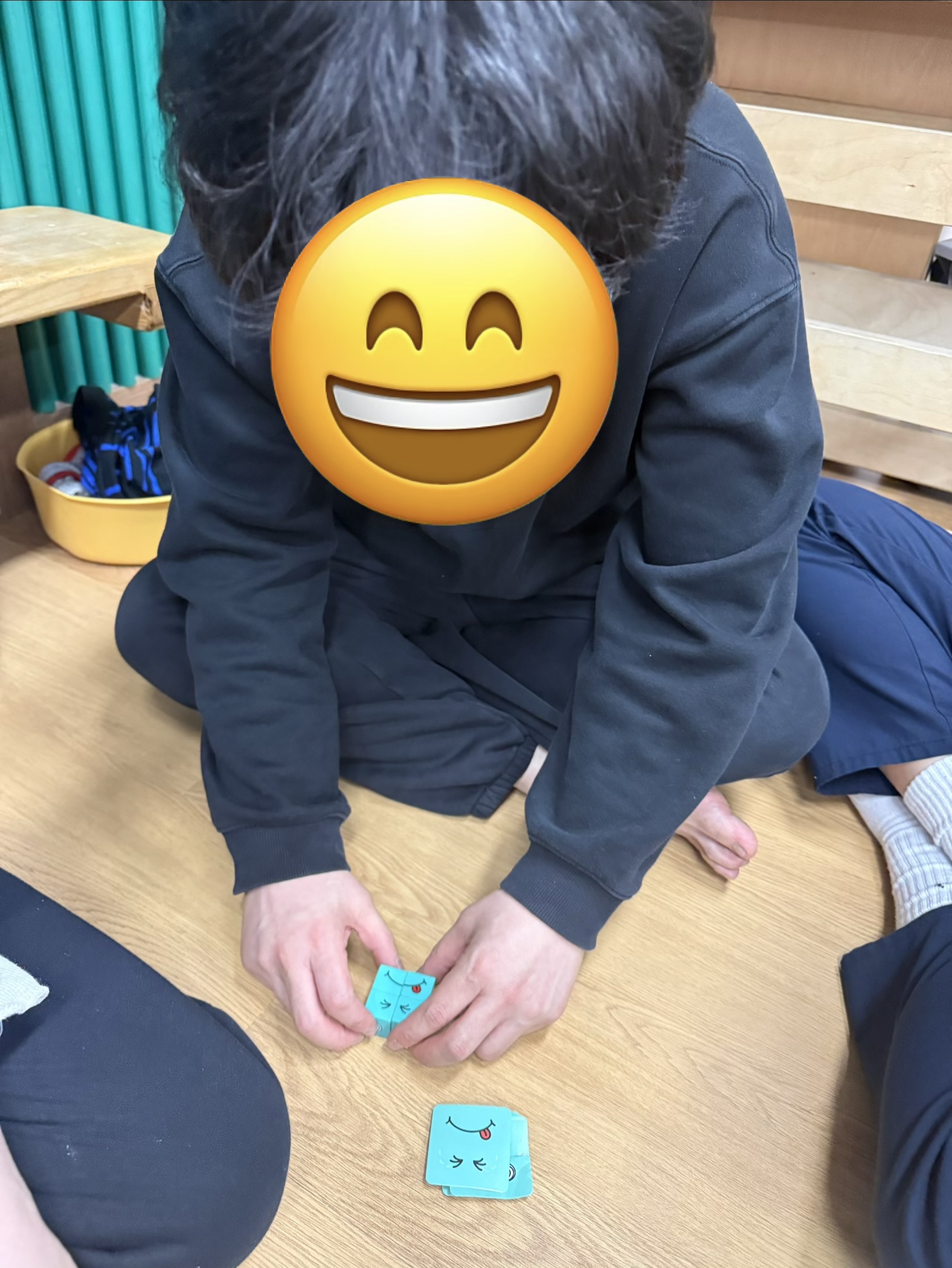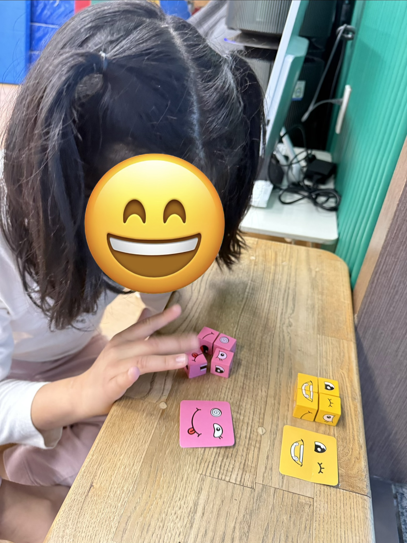 팀워커를 착용하고 또래와 함께 협동하여 눈과 입이 그려진 블럭을 4개 획득하여 다양한 표정이 그려진 카드에 맞게 얼굴 완성해보기~