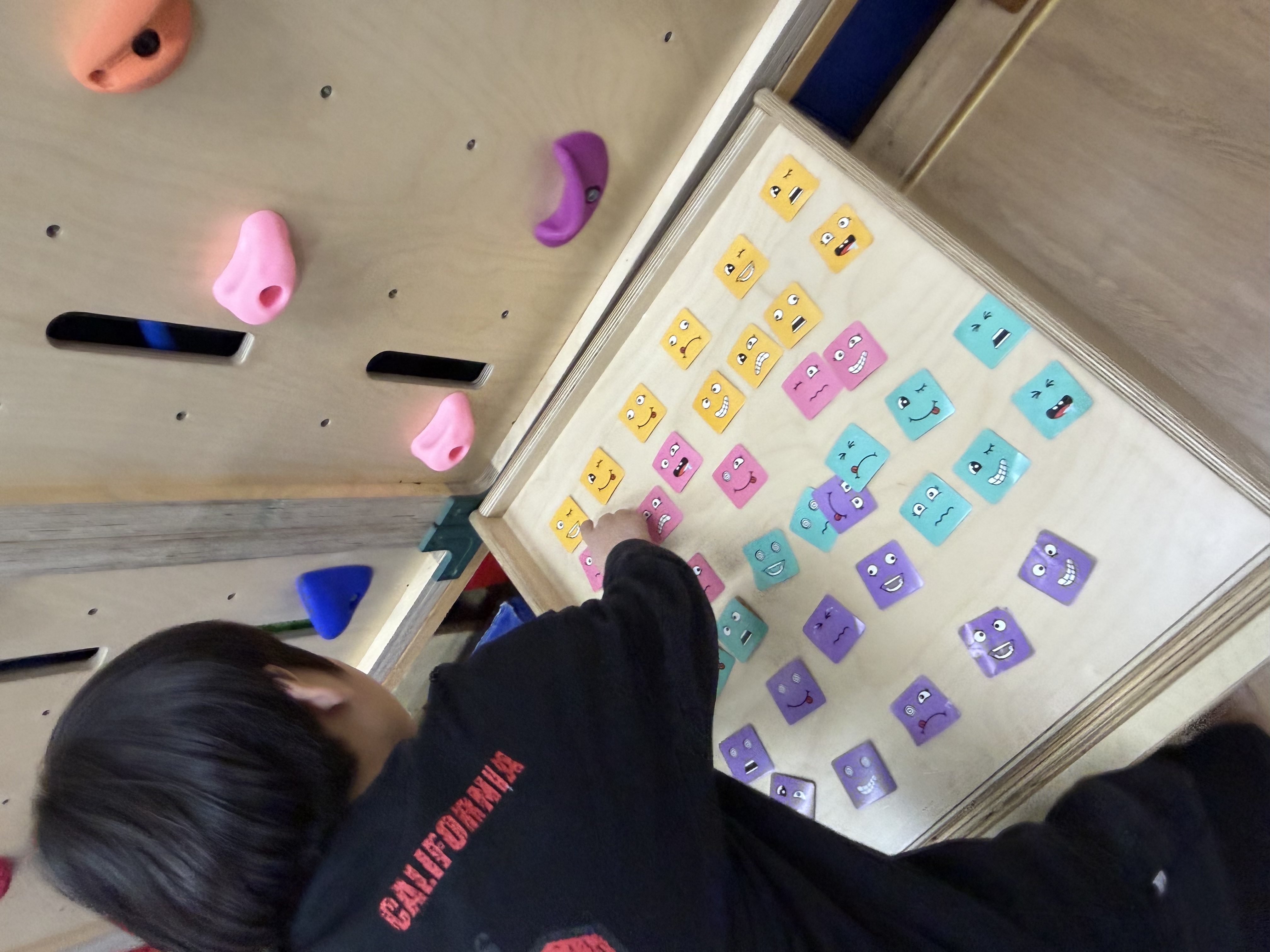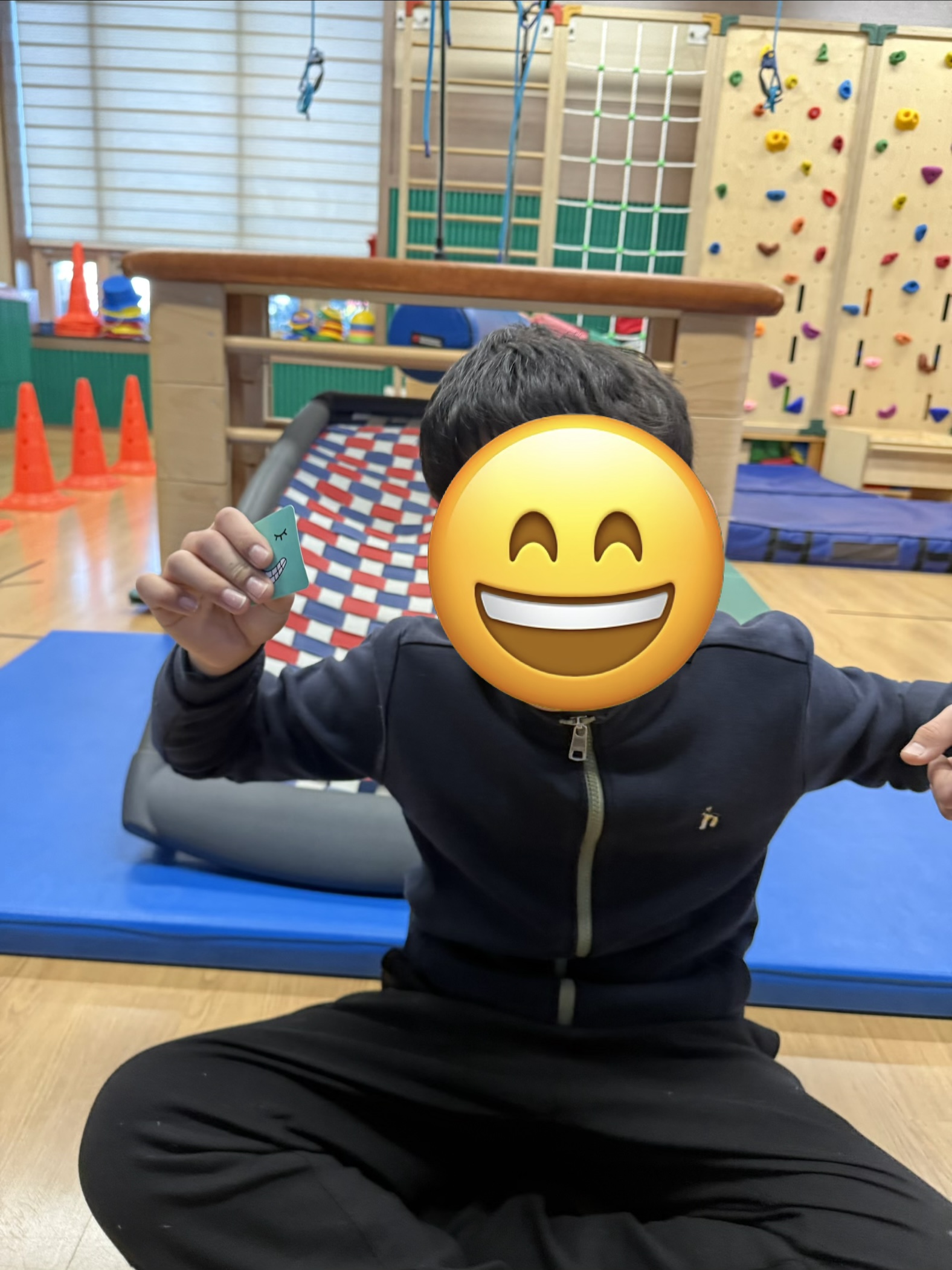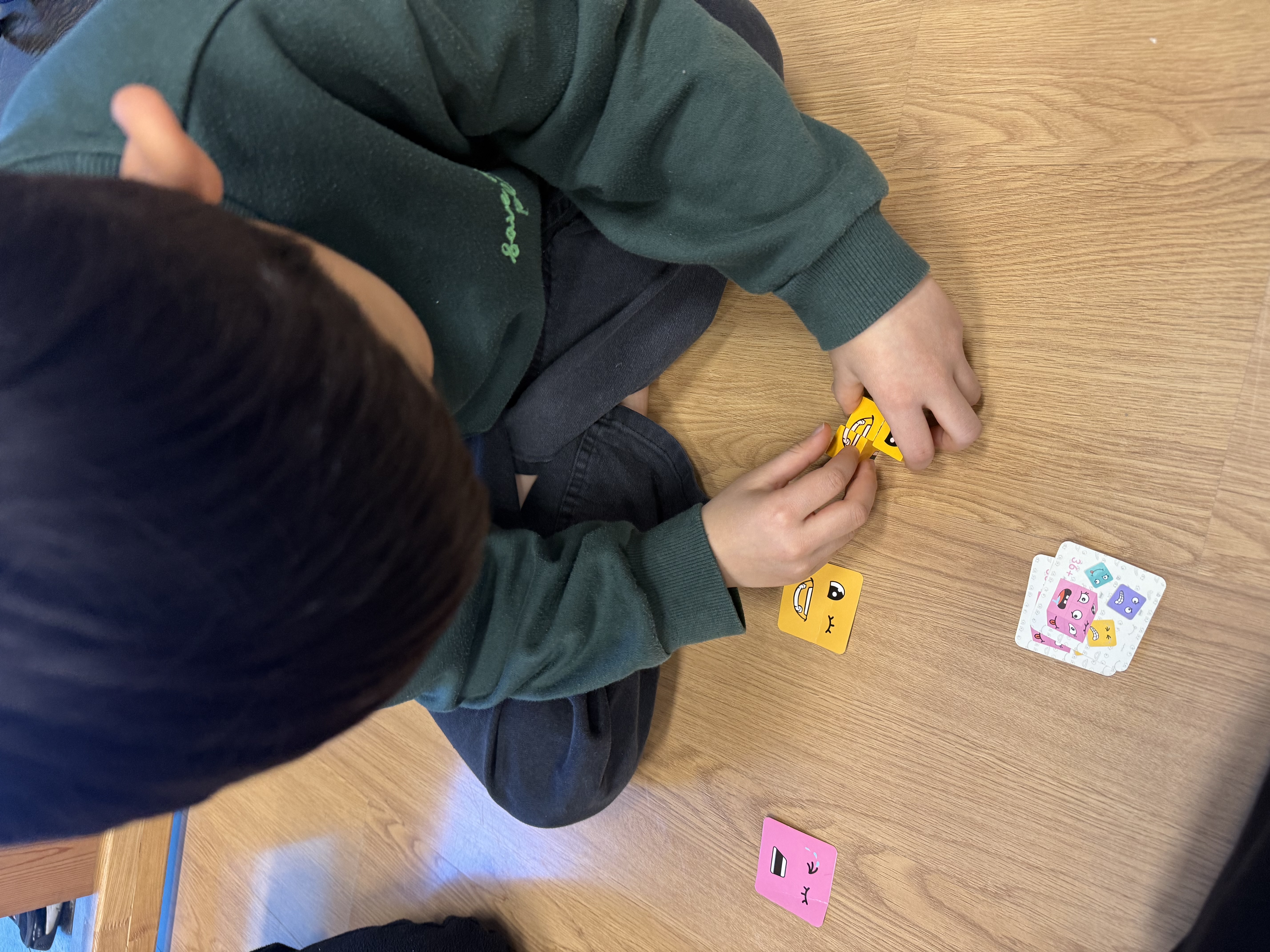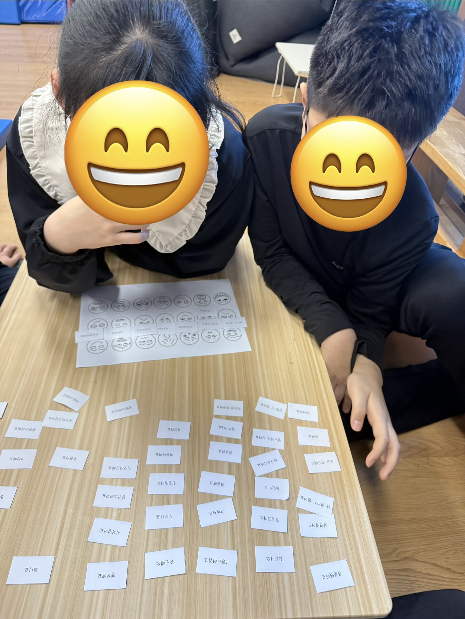 팀워커를 착용하고 또래와 함께 협동하여 눈과 입이 그려진 블럭을 4개 획득하여 다양한 표정이 그려진 카드에 맞게 얼굴 완성해보기~