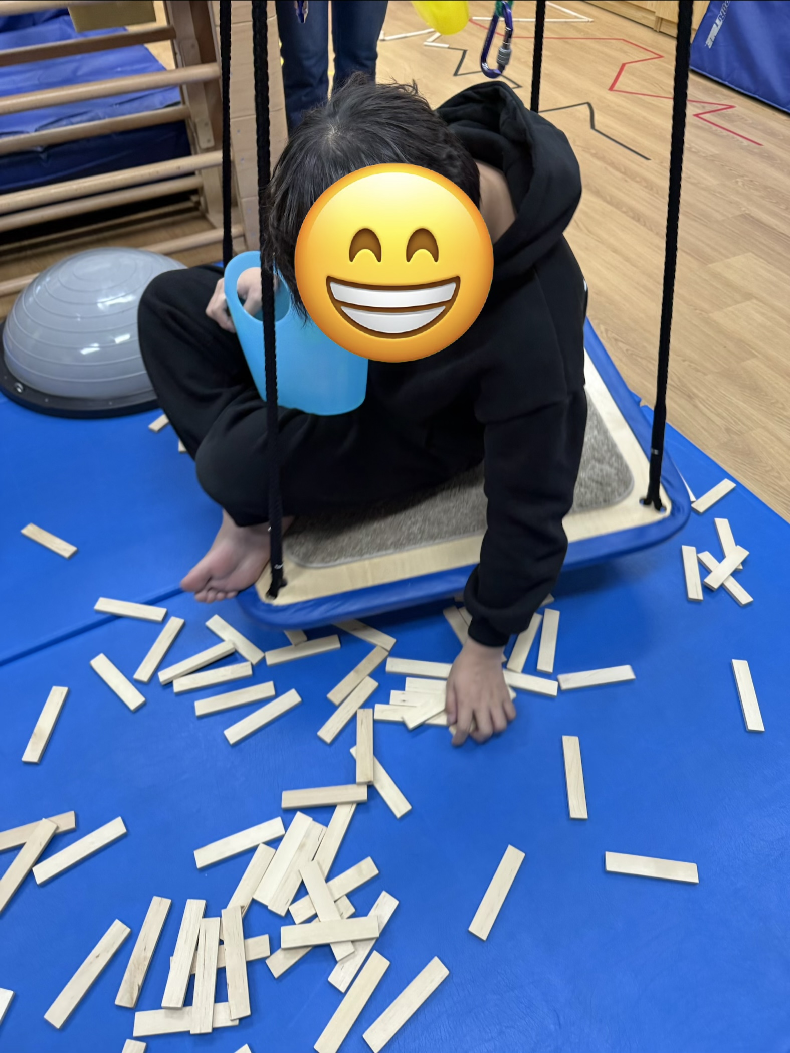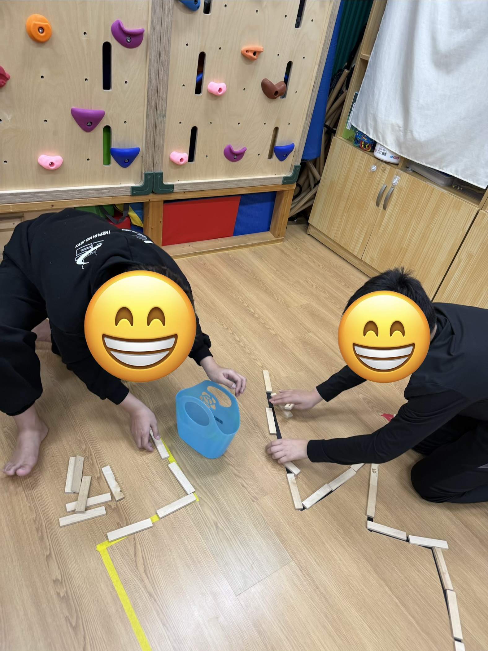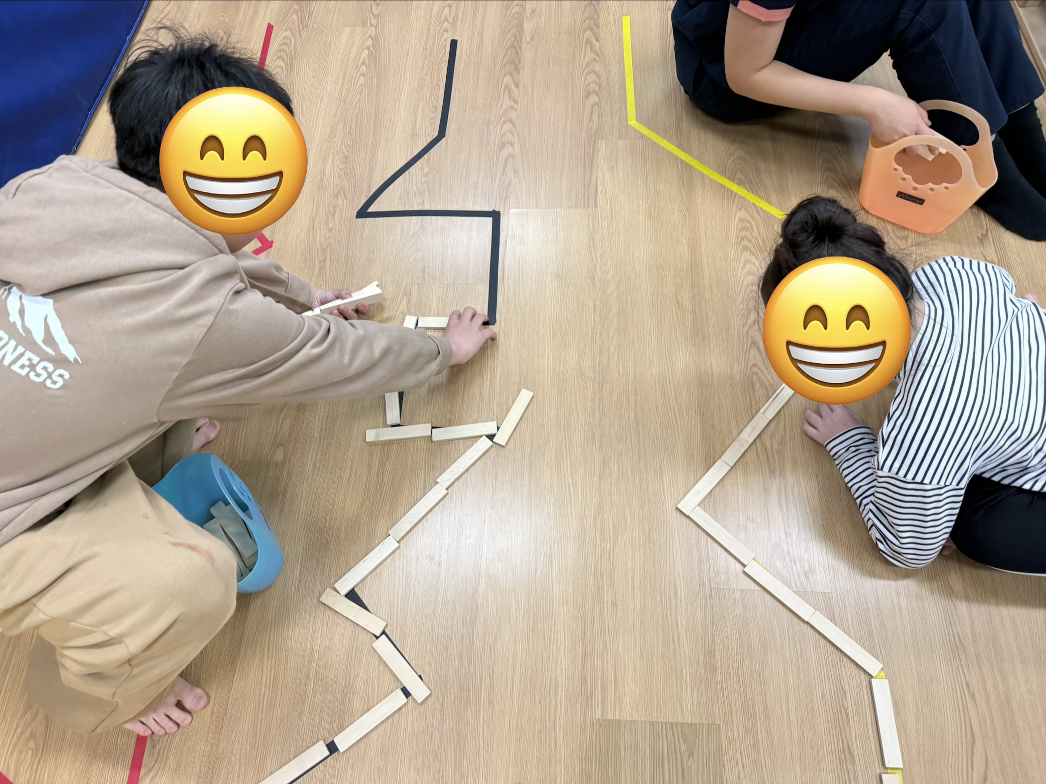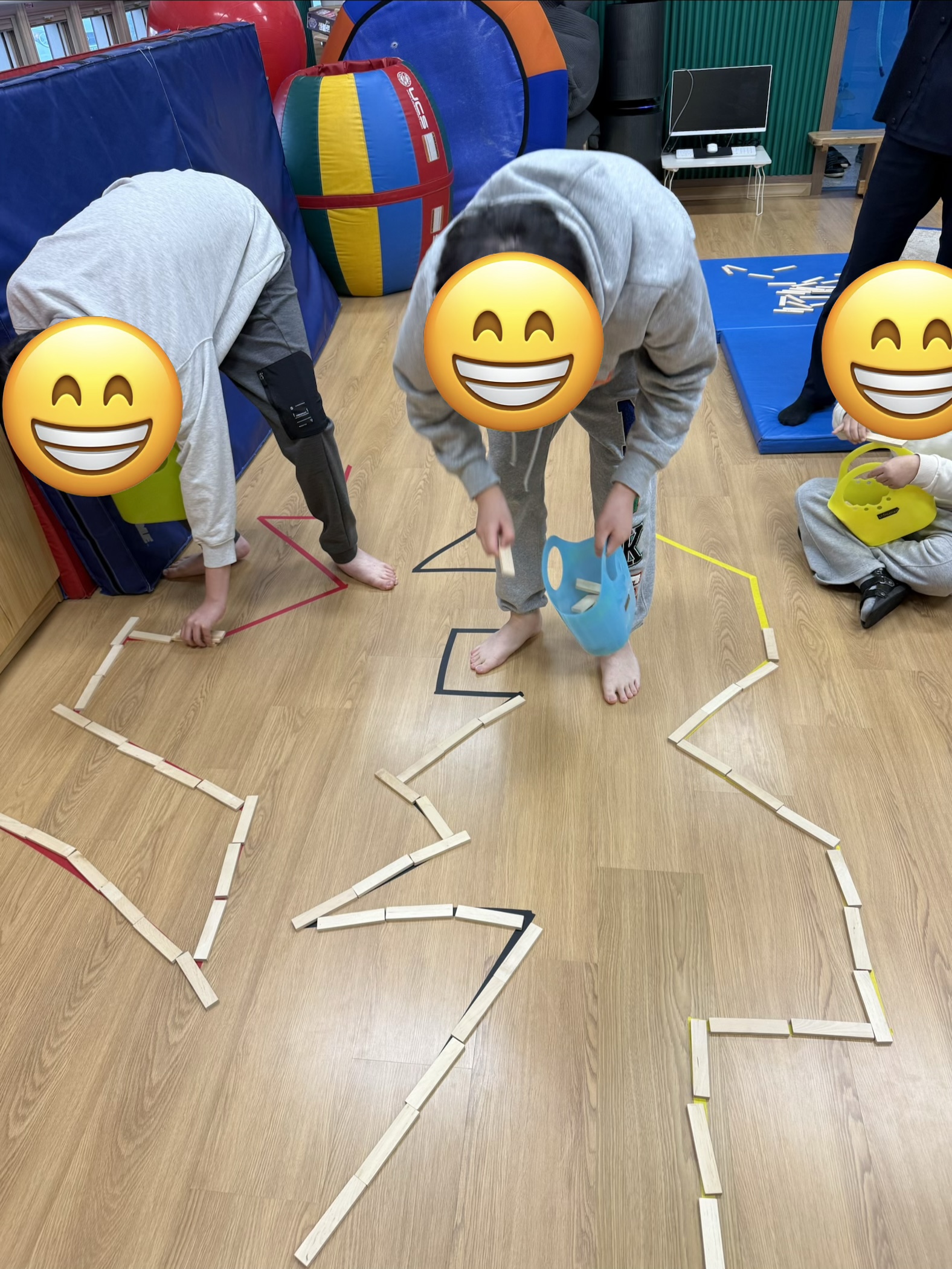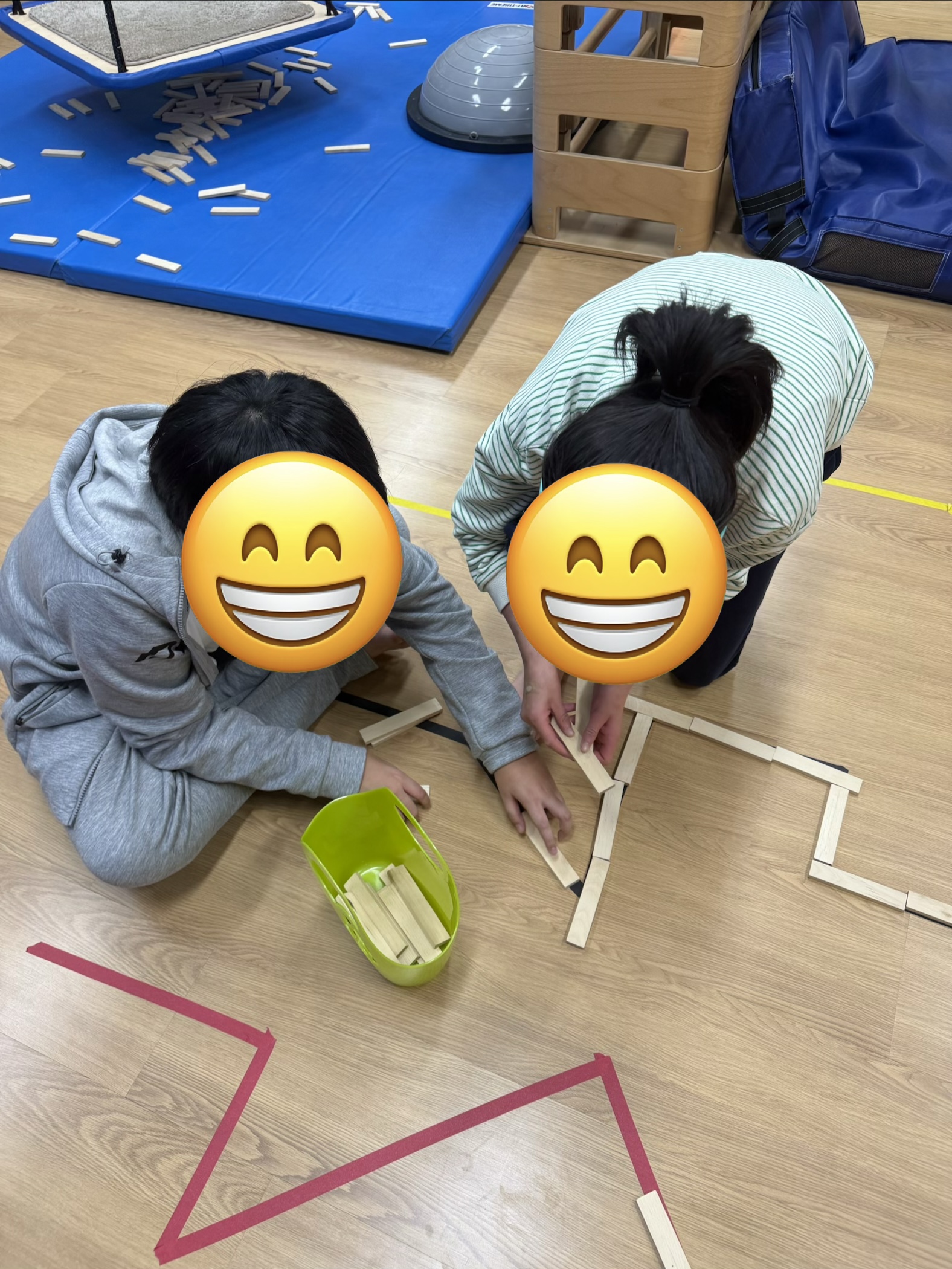 블럭을 잡을 때 타이밍 조절과 눈손협응, 자세조절이 요구되고, 시각적인 정보를 바탕으로 선을 인식하고 양손을 협응해서 블럭을 맞춰보는 시간을 가졌습니다^^