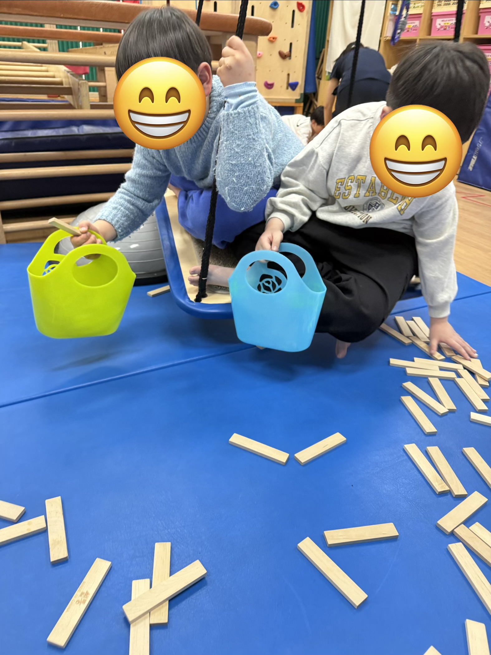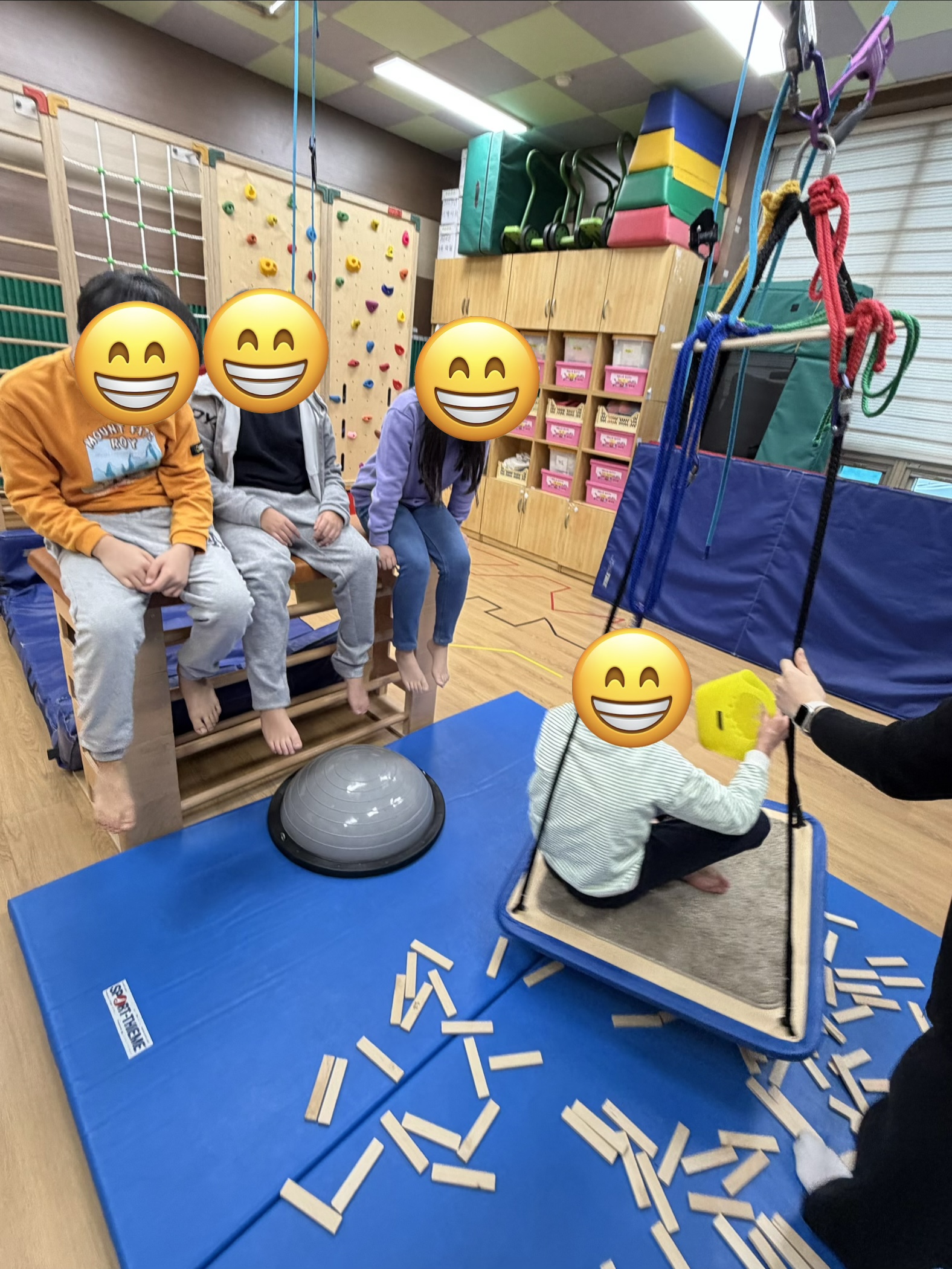 스윙에 앉은자세로 호명하는 개수에 맞춰 나무블럭을 획득하고 테이핑 선을 따라 연결하기