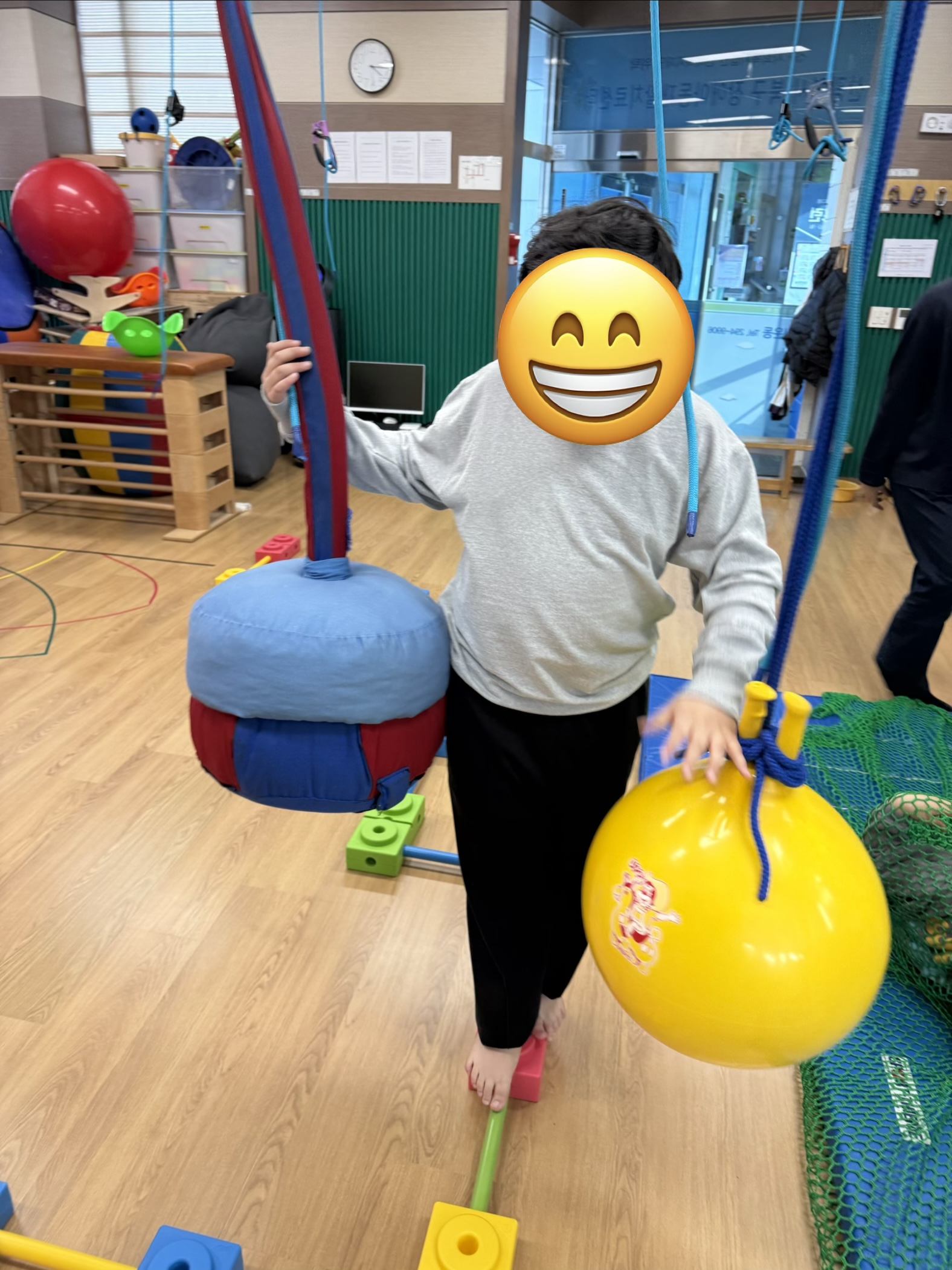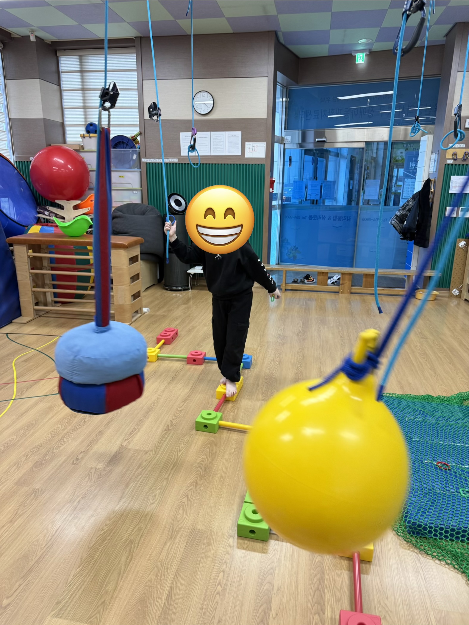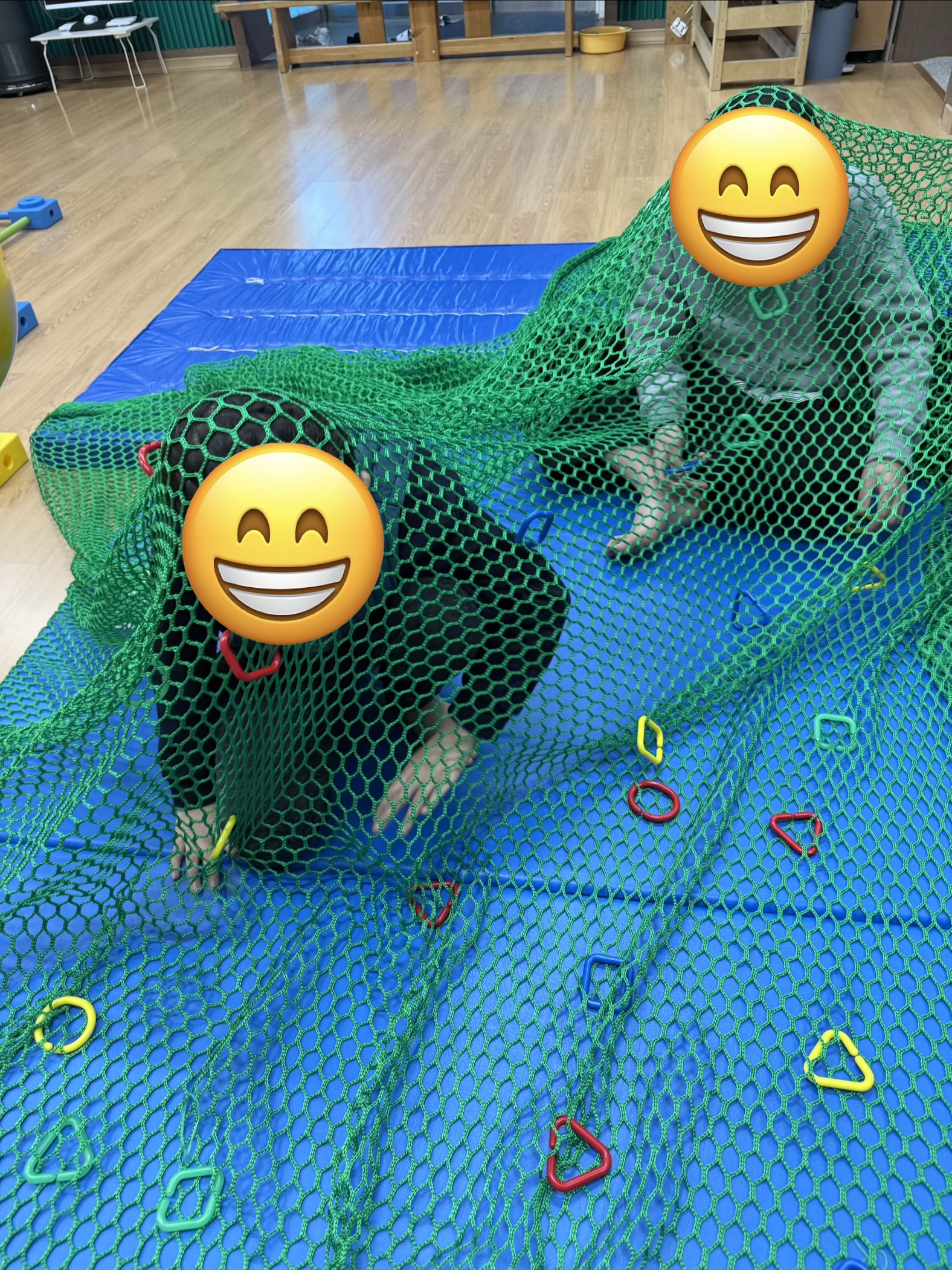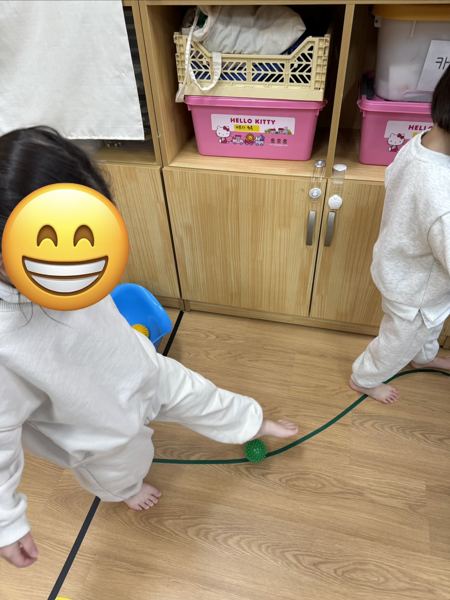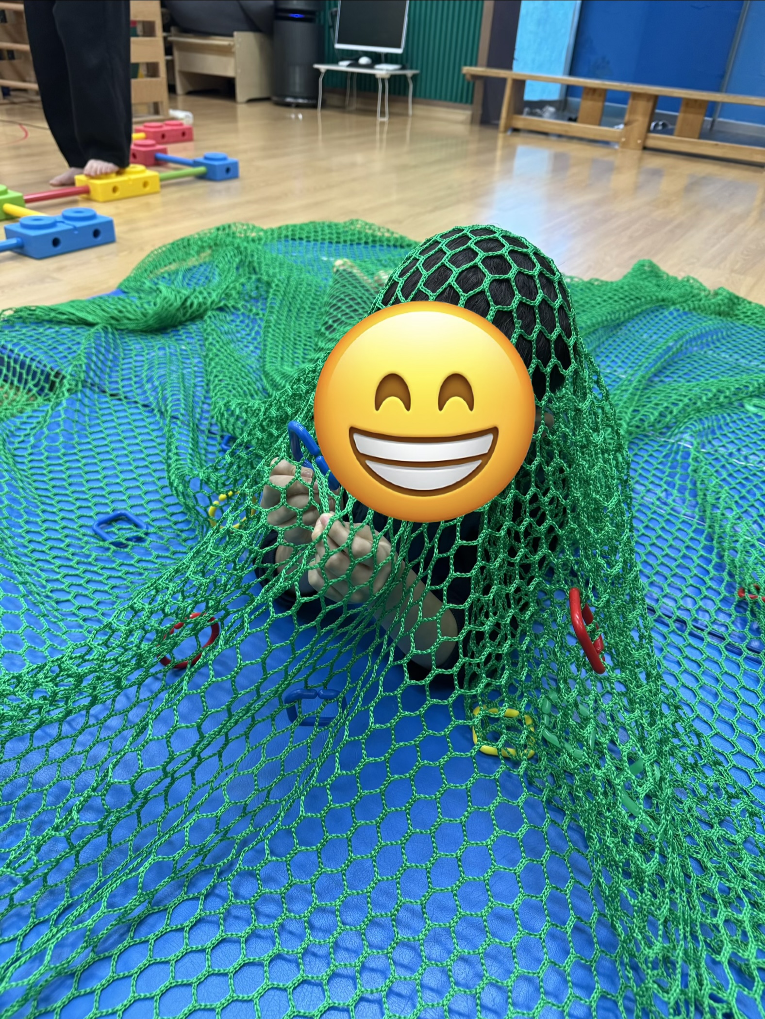 엎드린 자세로 그물 밑을 지나가고 촉감볼을 발로 눌러 이동시키면서 촉감각 입력조절에 도움을 주고 연결고리를 기억하고 찾는 과정에서 집중력, 시각단기기억, 형태인식, 색구분을 위한 시지각변별능력을 함께 사용해보았어요~