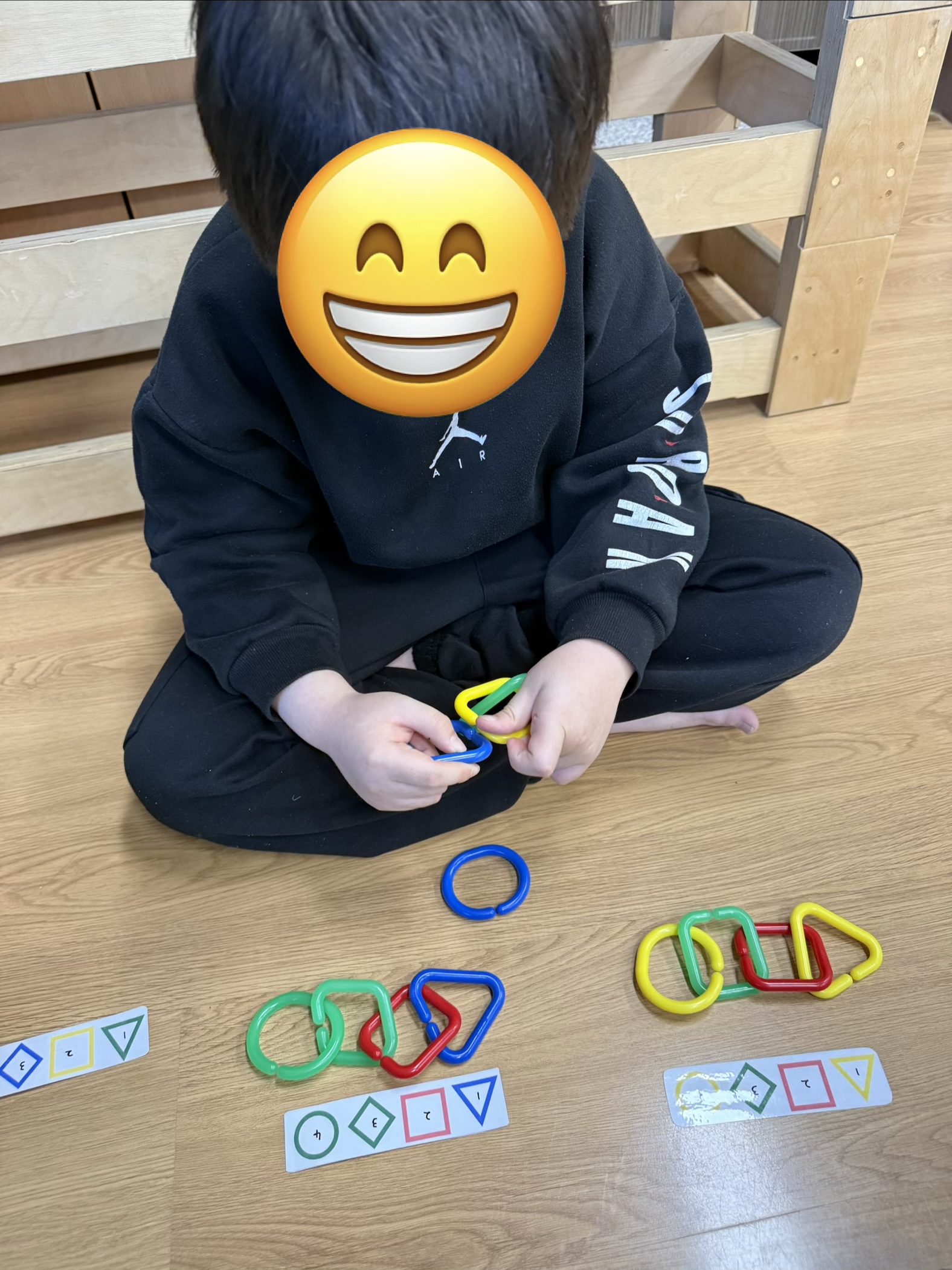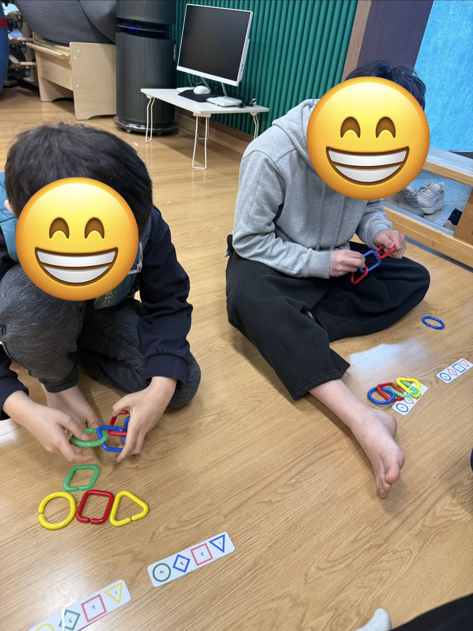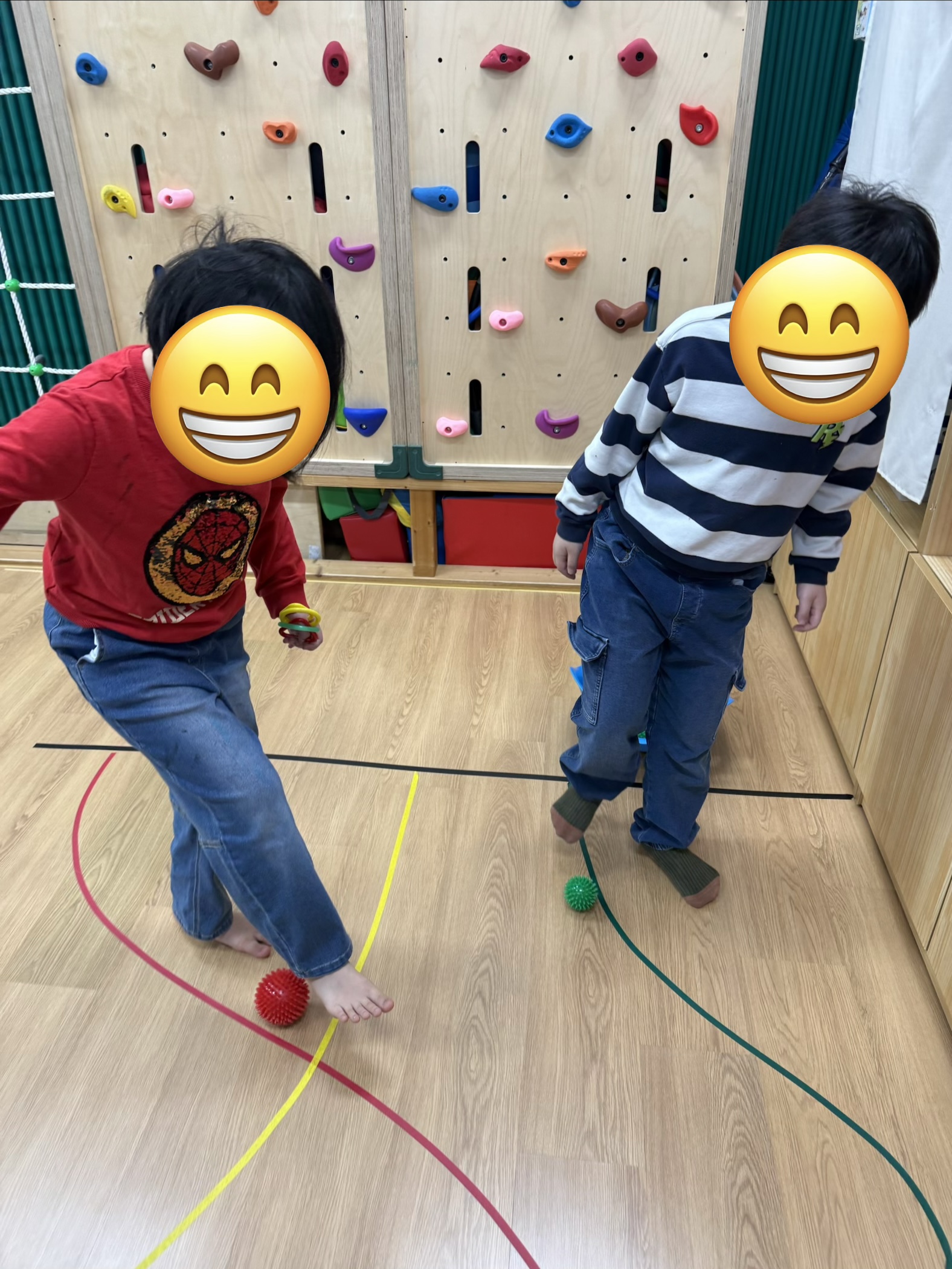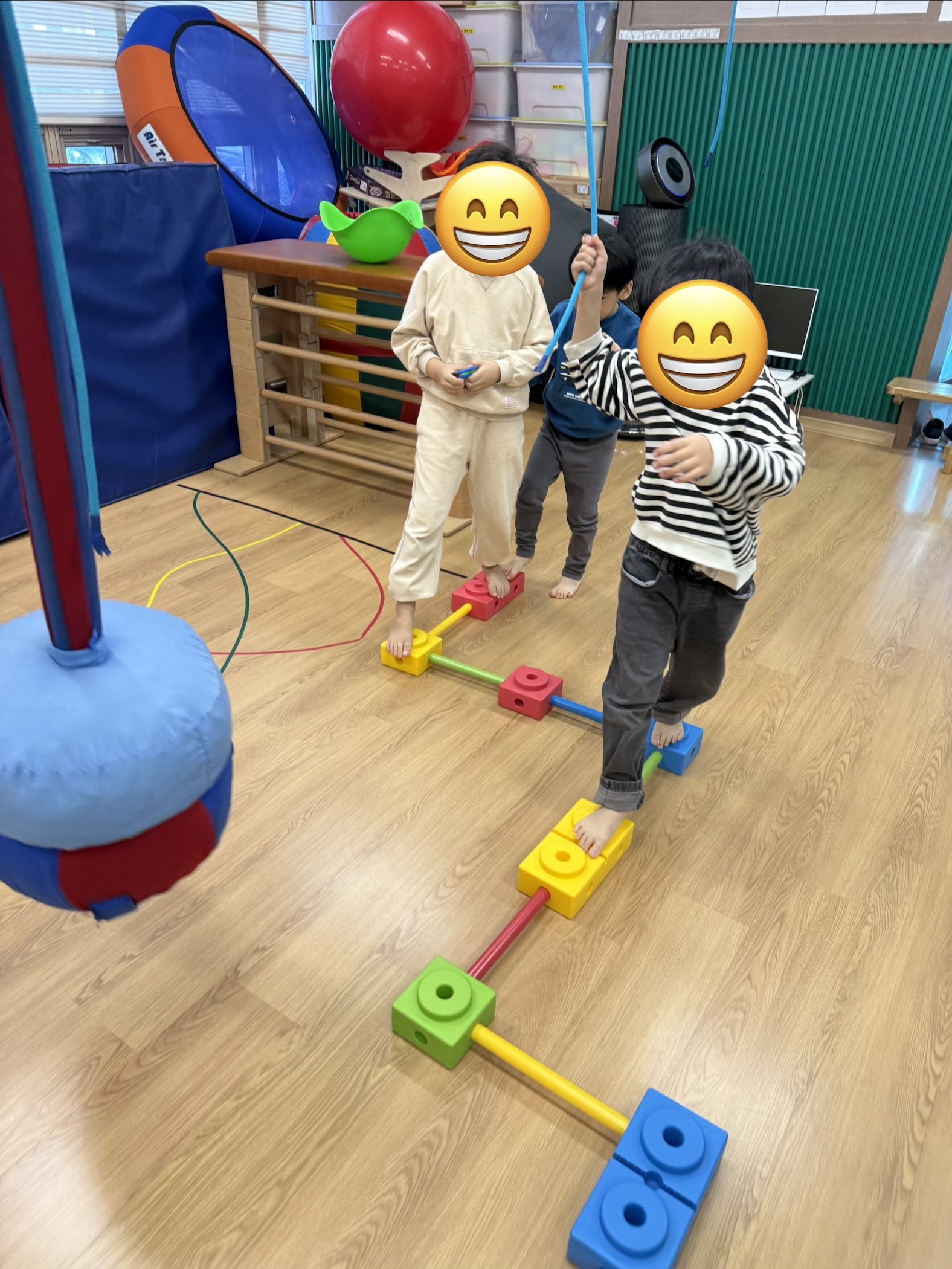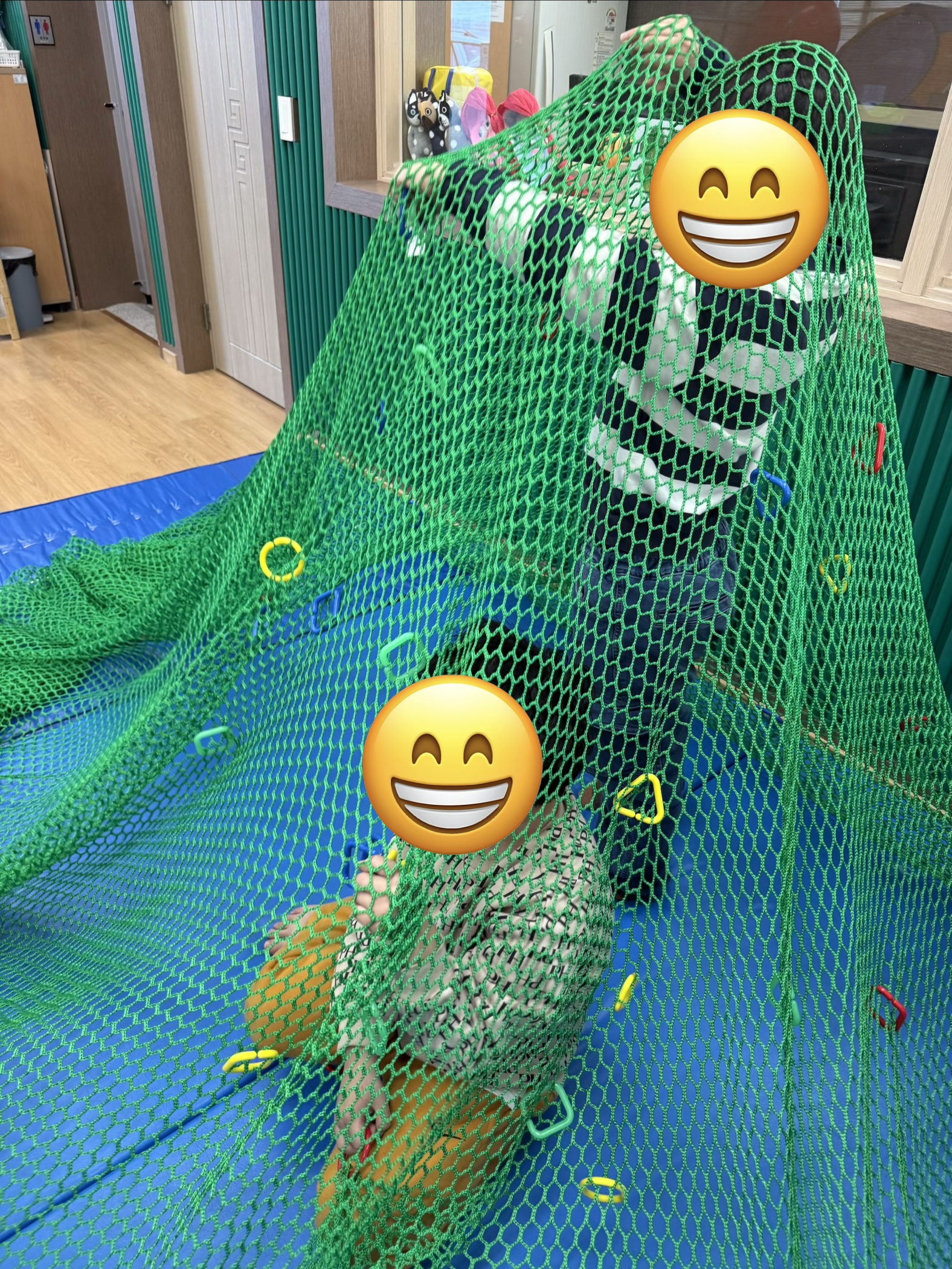 엎드린 자세로 그물 밑을 지나가고 촉감볼을 발로 눌러 이동시키면서 촉감각 입력조절에 도움을 주고 연결고리를 기억하고 찾는 과정에서 집중력, 시각단기기억, 형태인식, 색구분을 위한 시지각변별능력을 함께 사용해보았어요~